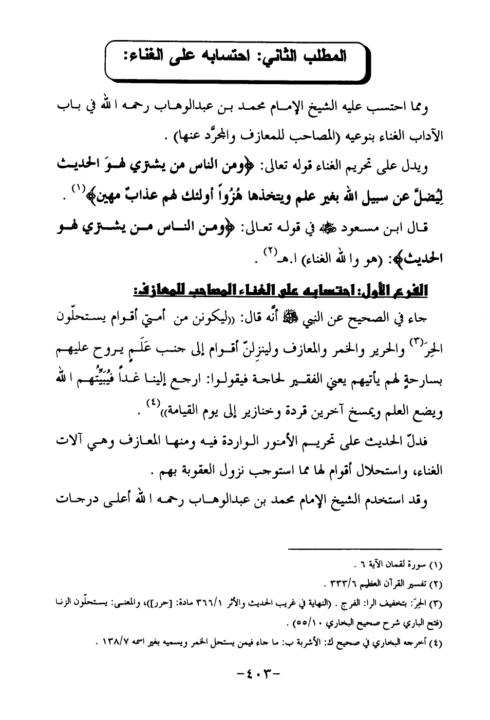ومما احتسب عليه الشيخ الإمام محمد بن عبد الوهاب رحمه الله في باب الآداب الغناء بنوعيه (المصاحب للمعازف والمجرَّد عنها) .