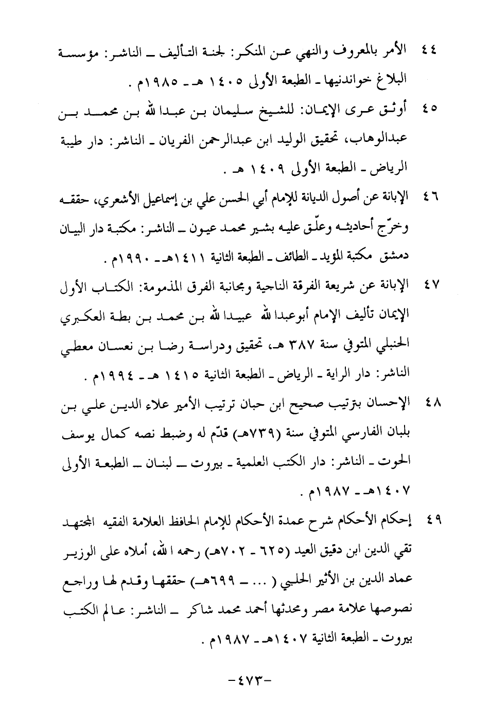 43- الأمر بالمعروف والنهي عن المنكر: لأبي بكر أحمد بن محد بن هارون الخلال, دراسة وتحقيق عبد القادر أحمد عطا- الناشر: دار الكتب العلمية- بيروت- الطبعة الأولى 1406هـ-1986م- توزيع دار الباز- مكة المكرمة.