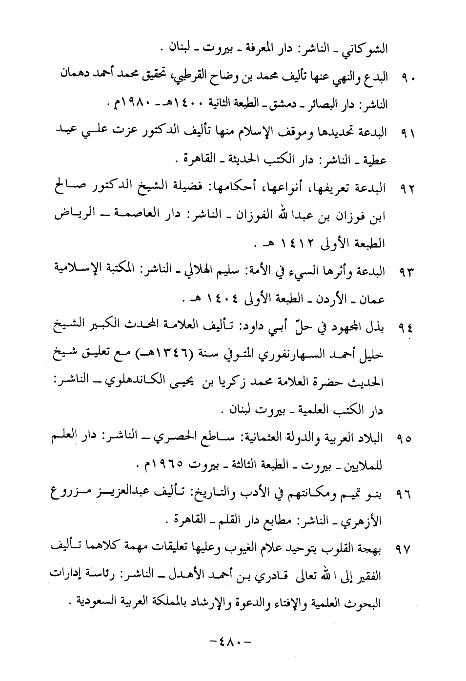 92-البدعة تعريفها , أنواعها, أحكامها: فضيلة الشيخ الدكتور صالح ابن فوزان الفوزان بن عبد الله الفوزان- الناشر: دار العاصمة- الرياض الطبعة الأولى 1412هـ.