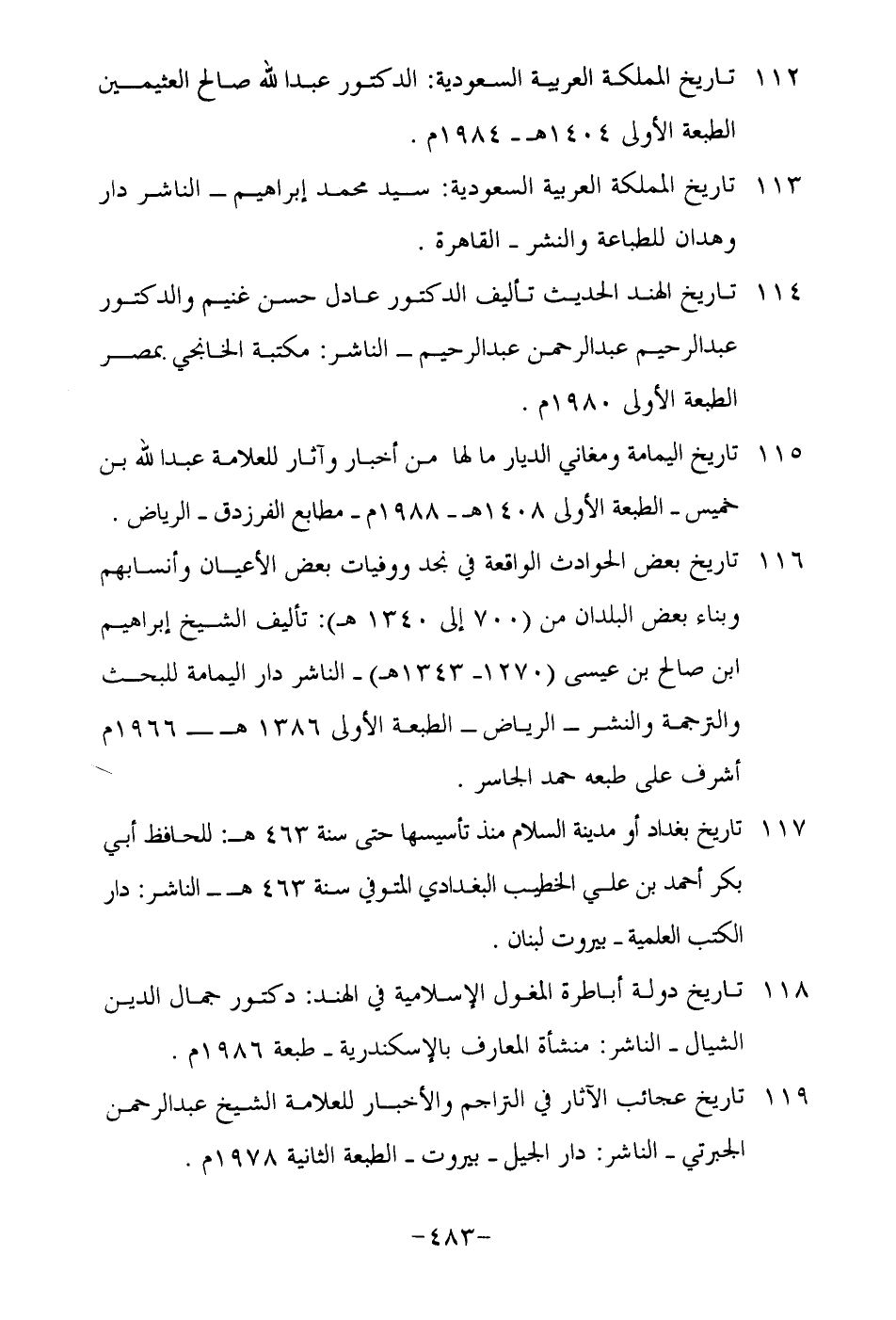 116-تاريخ بعض الحوادث الواقعة في نجد ووفيات بعض الأعيان وأنسابهم وبناء بعض البلدان من "700إلى 1340هـ": تأليف الشيخ إبراهيم ابن صالح بن عيسى "1270-1343هـ" – الناشر: دار اليمامة للبحث والترجمة والنشر- الرياض- الطبعة الأولى 1386هـ-1966م أشرف على طبعه حمد الجاسر.