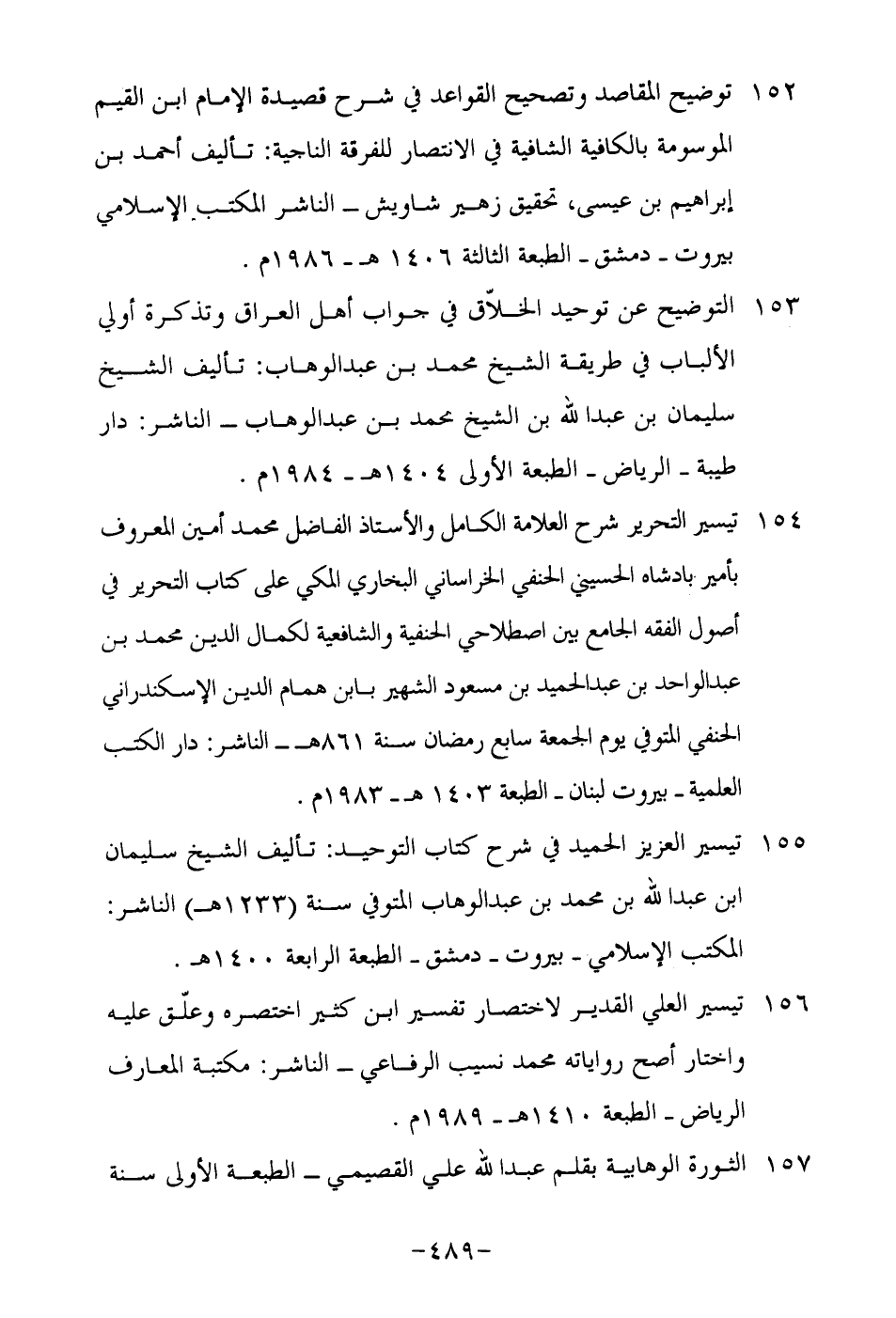 155-تيسير العزيز الحميد في شرح كتاب التوحيد: تأليف الشيخ سليمان ابن عبد الله بن محمد بن عبد الوهاب المتوفى سنة "1233هـ" الناشر: المكتب الإسلامي- بيروت- دمشق- الطبعة الرابعة 1400هـ.
