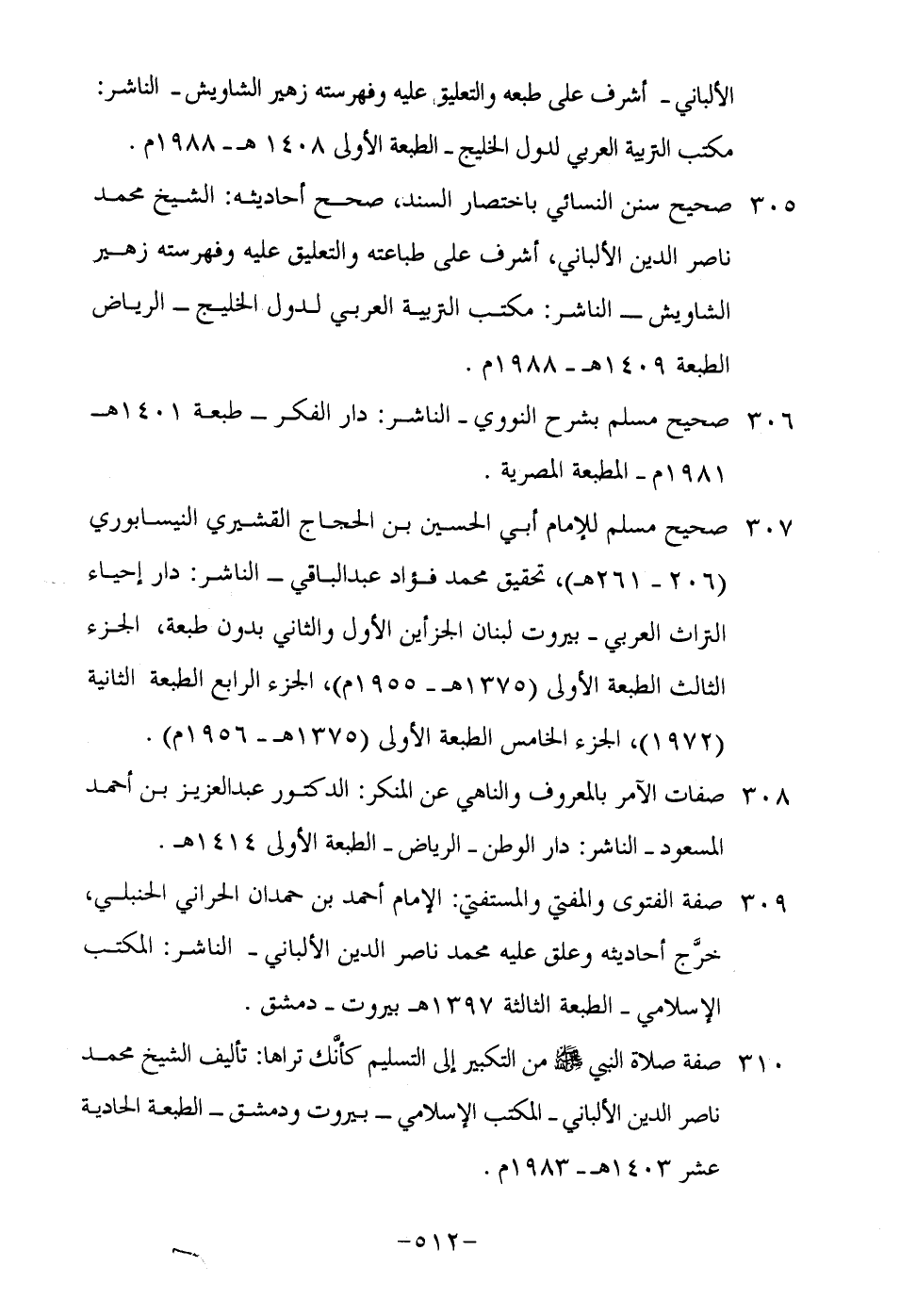 307-صحيح مسلم للإمام أبي الحسين بن الحجاج القشيري النيسابوري "206-261هـ", تحقيق محمد فؤاد عبد الباقي- الناشر: دار إحياء التراث العربي- بيروت لبنان الجزأين الأول والثاني بدون طبعة, الجزء الثالث الطبعة الأولى "1375هـ-1955م", الجزء الرابع الطبعة الثانية "1972", الجزء الخامس الطبعة الأولى "1375هـ-1956م".