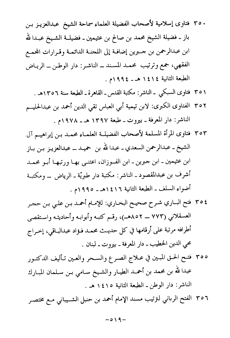 353-فتاوى المراة المسلمة لأصحاب الفضيلة العلماء محمد بن إبراهيم آل الشيخ- عبد الرحمن السعدي- عبد الله بن حميد- عبد العزيز بن باز- ابن عثيمين- ابن جبرين- ابن فوزان, اعتنى بها ورتبها أبو محمد أشرف بن عبد المقصود- الناشر: مكتبة دار طبرية- الرياض- ومكتبة أضواء السلف- الطبعة الثانية 1416هـ-1995م.