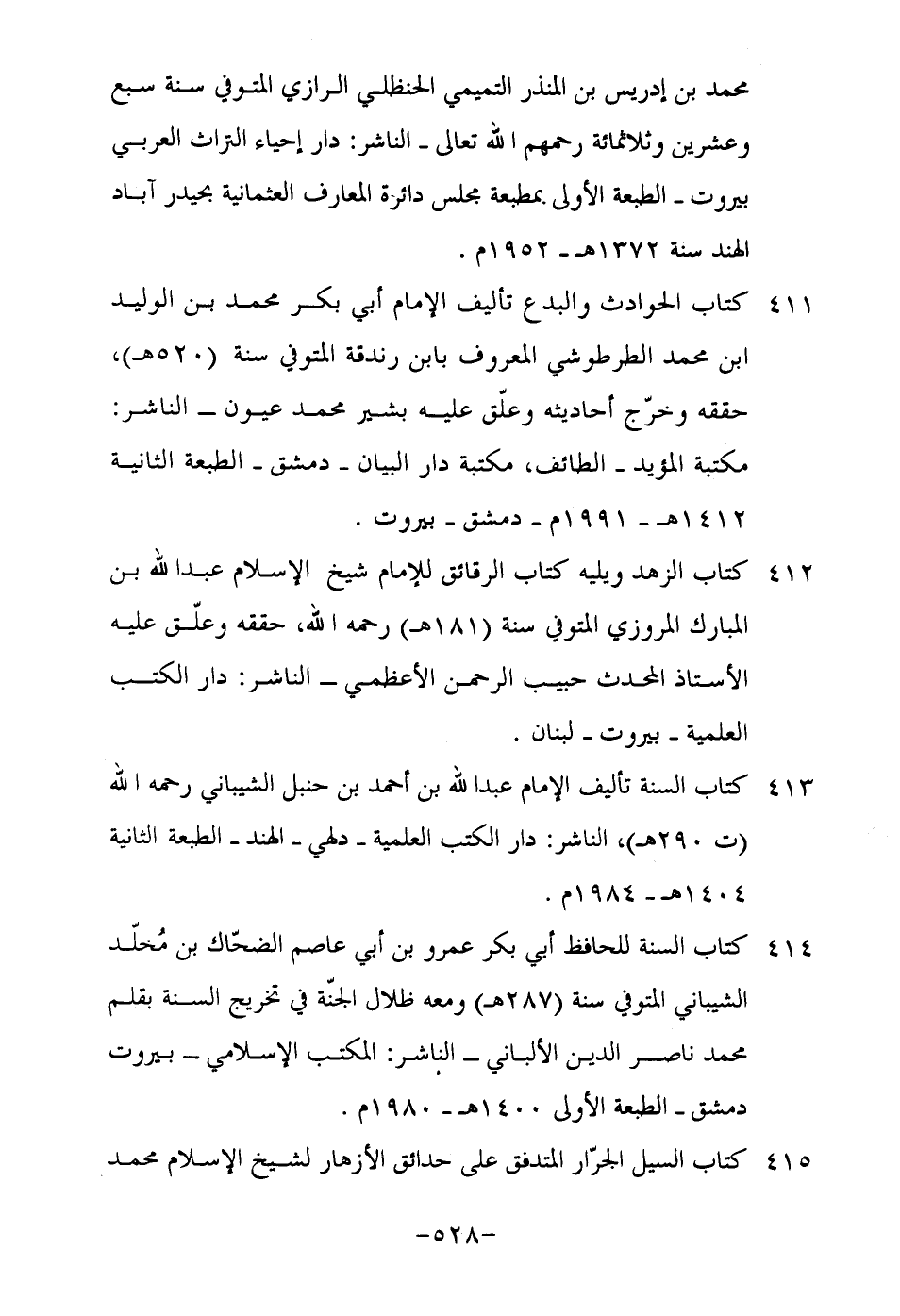 411-كتاب الحوادث والبدع تأليف الغمام أبي بكر محمد بن الوليد ابن محمد الطرطوشي المعروف بابن رندقة المتوفى سنة "520هـ", حققه وخرج أحاديثه وعلق عليه بشير محمد عيون- الناشر: مكتبة المؤيد- الطائف, مكتبة دار البيان- دمشق- الطبعة الثانية 1412هـ-1991م.- دمشق- بيروت.