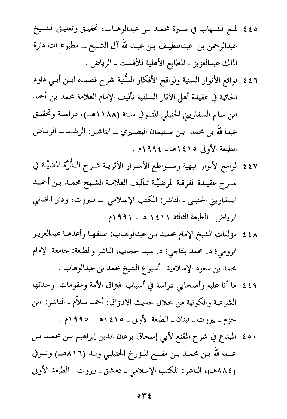 448-مؤلفات الشيخ الغمام ممد بن عببد الوهاب: صنفها وأعدها عبد العزيز الرومي, د. محمد بلتاجي, د. سيد حجاب, الناشر والطبعة: جامعة الغمام محمد بن سعود الإسلامية- أسبوع الشيخ محمد بن عبد الوهاب.