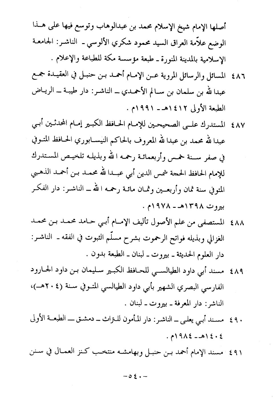 488 المستصفى من علم الأصول تأليف الإمام أبي حامد محمد بن محمد الغزالي وبذيله فواتح الرحموت بشرح مسلّم الثبوت في الفقه- الناشر: دار العلوم الحديثة- بيروت- لبنان- الطبعة بدون.