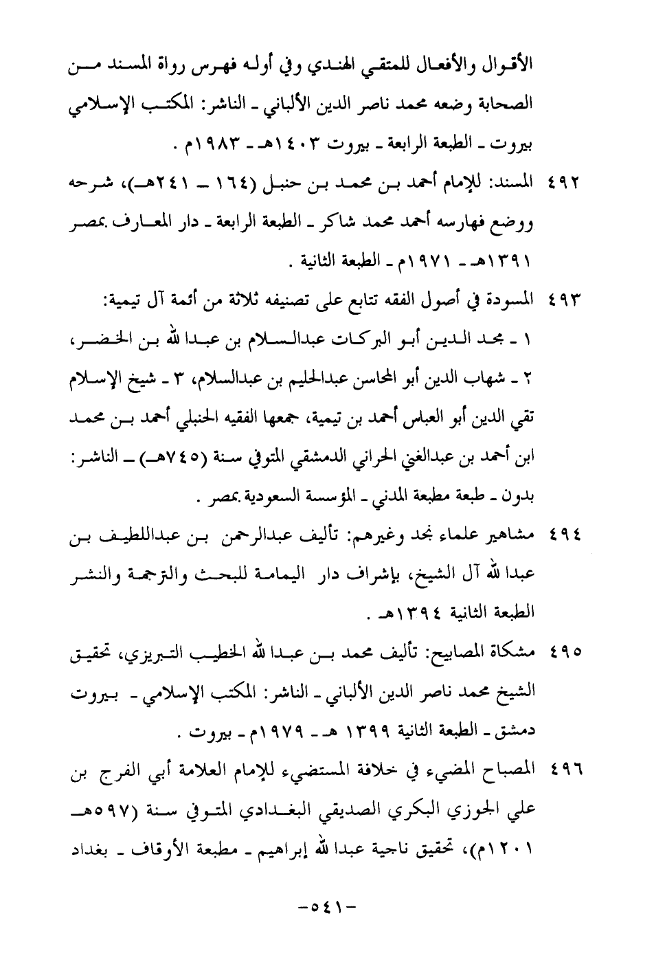الأقوال والأفعال للمتقي الهندي وفي أوله فهرس رواة المسند من الصحابة وضعه محمد ناصر الدين الألباني- الناشر: المكتب الإسلامي بيروت- الطبعة الرابعة- بيروت 1403هـ- 1983م.