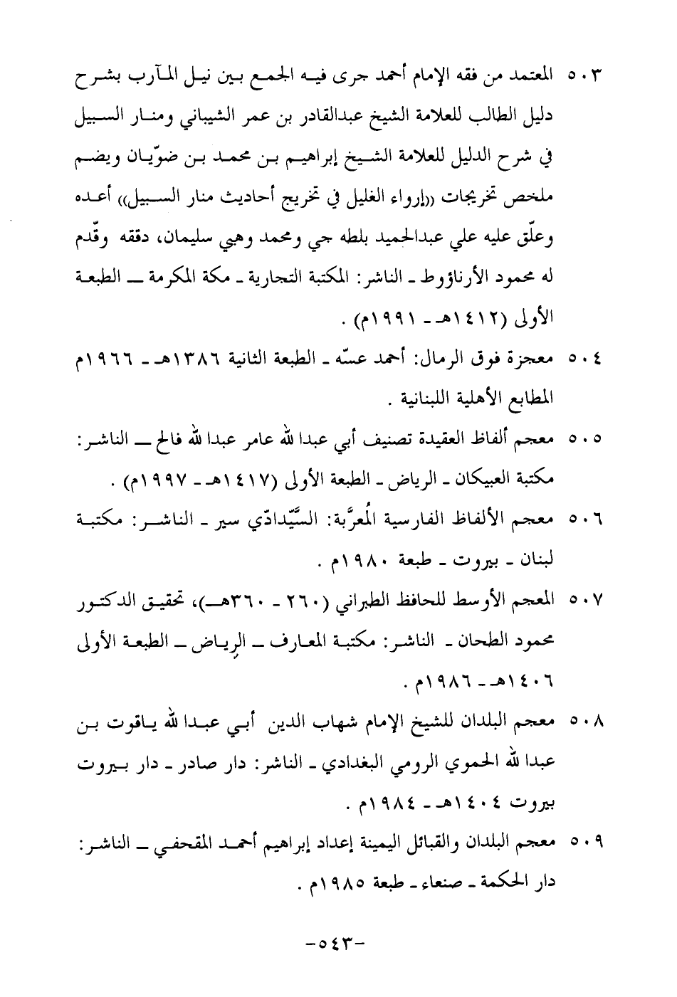 506 معجم الألفاظ الفارسية المُعرَّبة: السَّيّدادّي سير- الناشر: مكتبه لبنان- بيروت- طبعة 1980م. 557 المعجم الأوسط للحافظ الطبراني (260- 360هـ) ، تحقيق الدكتور محمود الطحان- الناشر: مكتبة المعارف- الرياض- الطبعة الأولى 1406هـ- 1986م.
