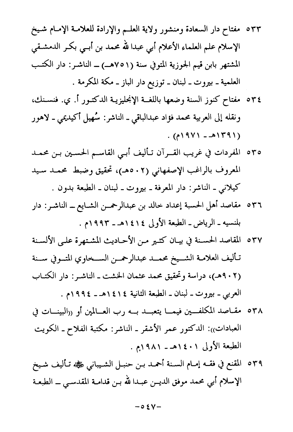 533 مفتاح دار السعادة ومنشور ولاية العلم والإرادة للعلامة الإمام شيخ الإسلام علم العلماء الأعلام أبي عبد الله محمد بن أبي بكر الدمشقي المشتهر بابن قيم الجوزية المتوفي سنة (751هـ) - الناشر: دار الكتب العلمية- بيروت- لبنان- توزيع دار الباز- مكة المكرمة.