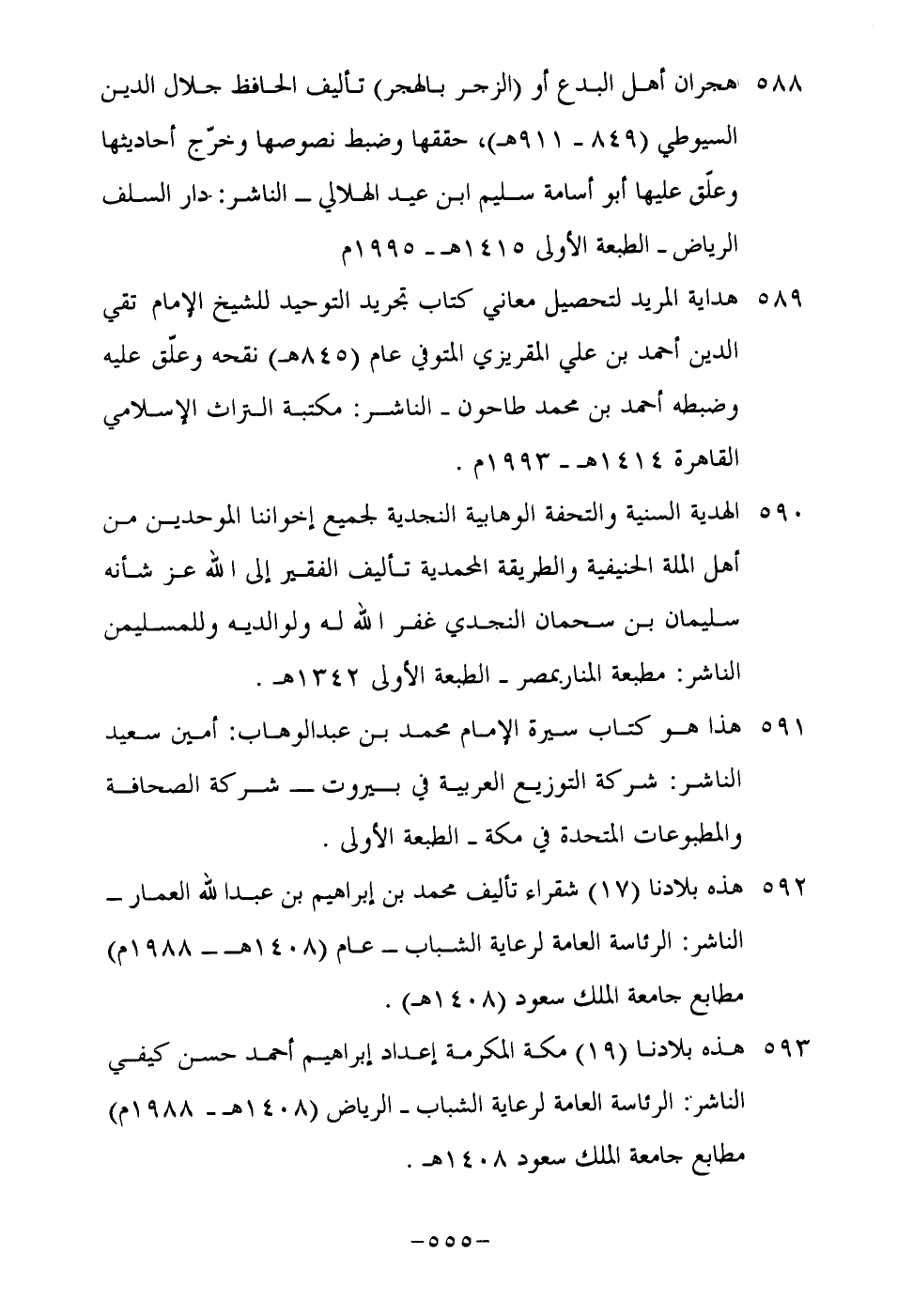 588 هجران أهل البدع أو (الزجر بالهجر) تأليف الحافظ جلال الدين السيوطي (849- 911هـ) ، حققها وضبط نصوصها وخرّج أحاديثها وعلّق عليها أبو أسامة سليم ابن عيد الهلالي- الناشر:- دار السلف الرياض- الطبعة الأولى 1415هـ- 1995م.