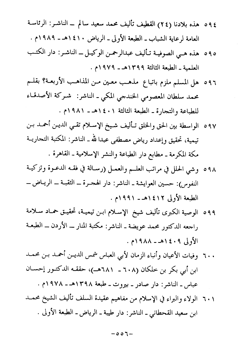 599 الوصية الكبرى تأليف شيخ الإسلام ابن تيمية، تحقيق حماد علامة راجعه الدكتور محمد عويضة- الناشر: مكتبة المنار- الأردن- الطبعة الأولى 1409هـ- 1988م.