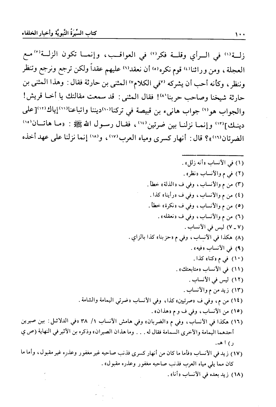 زلة «1» في الرأي وقلة فكر «2» في العواقب، وإنما تكون الزلة «3» مع العجلة، ومن ورائنا «4» قوم نكره «5» أن نعقد «6» عليهم عقدا ولكن ترجع ونرجع وتنظر وننظر، وكأنه أحب أن يشركه «7» في الكلام «7» المثنى بن حارثة فقال: وهذا المثنى بن حارثة شيخنا وصاحب حربنا «8» ! فقال المثنى: قد سمعت مقالتك يا أخا قريش! والجواب هو «9» جواب هانىء بن قبيصة في تركنا «10» ديننا واتباعنا «11» إياك «12» [على دينك] «13» وإنما نزلنا بين ضرتين «14» ، فقال رسول الله صلى الله عليه وسلم: «ما هاتان «15» الضرتان «16» » ؟ قال: أنهار كسرى ومياه العرب «17» ، و «18» إنما نزلنا على عهد أخذه