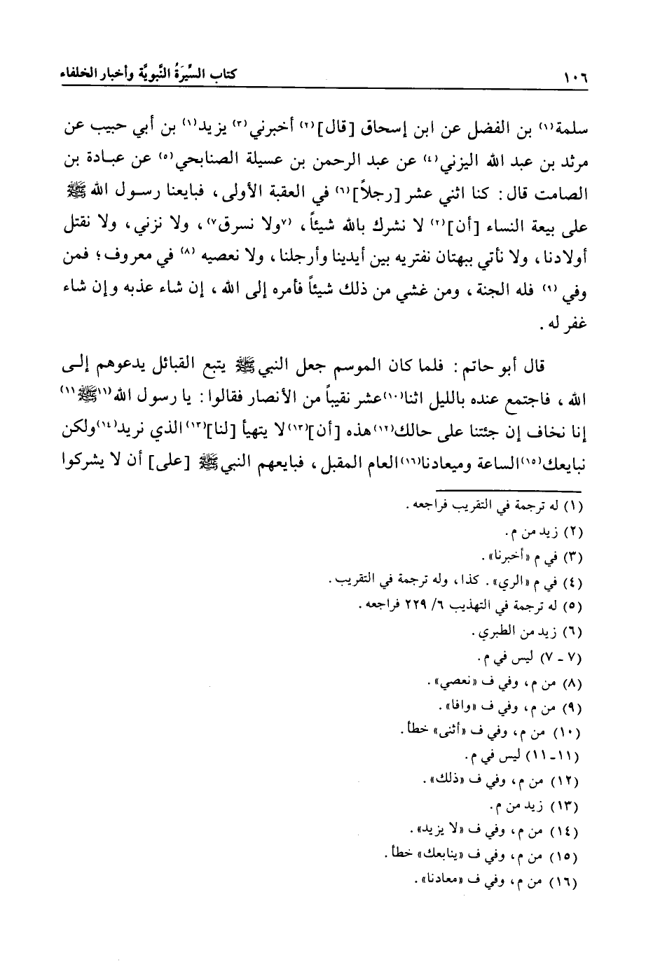 سلمة «1» بن الفضل عن ابن إسحاق [قال] «2» أخبرني «3» يزيد «1» بن أبي حبيب عن مرثد بن عبد الله اليزني «4» عن عبد الرحمن بن عسيلة الصنابحي «5» عن عبادة بن الصامت قال: كنا اثني عشر [رجلا] «6» في العقبة الأولى، فبايعنا رسول الله صلى الله عليه وسلم على بيعة النساء [أن] «2» لا نشرك بالله شيئا، «7» ولا نسرق «7» ، ولا نزني، ولا نقتل أولادنا، ولا نأتي ببهتان نفتريه بين أيدينا وأرجلنا، ولا نعصيه «8» في معروف؛ فمن وفي «9» فله الجنة، ومن غشي من ذلك شيئا فأمره إلى الله، إن شاء عذبه وإن شاء غفر له.
