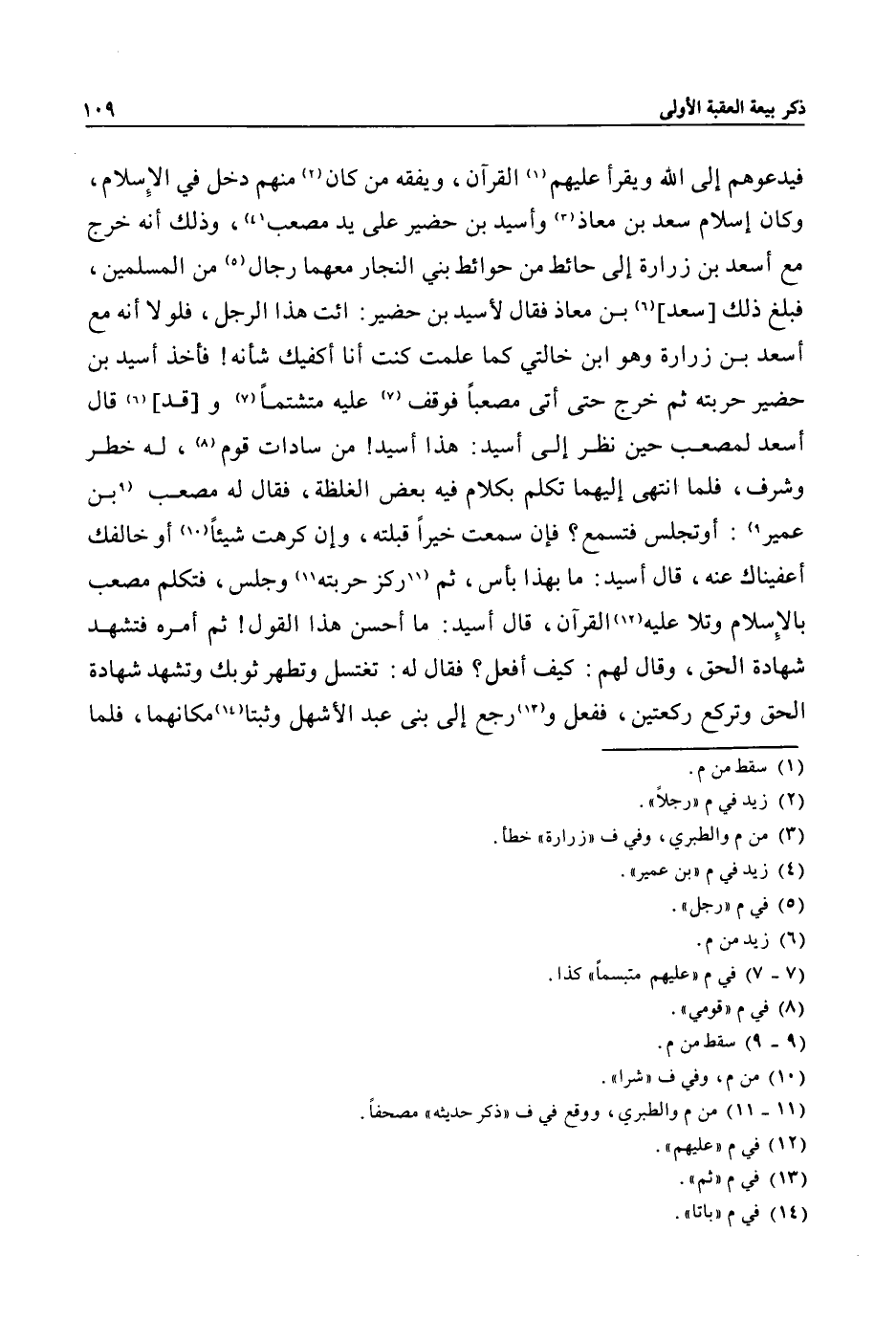 فيدعوهم إلى الله ويقرأ عليهم «1» القرآن، ويفقه من كان «2» منهم دخل في الإسلام، وكان إسلام سعد بن معاذ «3» وأسيد بن حضير على يد مصعب «4» ، وذلك أنه خرج مع أسعد بن زرارة إلى حائط من حوائط بني النجار معهما رجال «5» من المسلمين، فبلغ ذلك [سعد] «6» بن معاذ فقال لأسيد بن حضير: ائت هذا الرجل، فلولا أنه مع أسعد بن زرارة وهو ابن خالتي كما علمت كنت أنا أكفيك شأنه! فأخذ أسيد بن حضير حربته ثم خرج حتى أتى مصعبا فوقف «7» عليه متشتما «7» و [قد] «6» قال أسعد لمصعب حين نظر إلى أسيد: هذا أسيد! من سادات قوم «8» ، له خطر وشرف، فلما انتهى إليهما تكلم بكلام فيه بعض الغلظة، فقال له مصعب «9» بن عمير «9» : أو تجلس فتسمع؟ فإن سمعت خيرا قبلته، وإن كرهت شيئا «10» أو خالفك أعفيناك عنه، قال أسيد: ما بهذا بأس، ثم «11» ركز حربته «11» وجلس، فتكلم مصعب بالإسلام وتلا عليه «12» القرآن، قال أسيد: ما أحسن هذا القول! ثم أمره فتشهد شهادة الحق، وقال لهم: كيف أفعل؟ فقال له: تغتسل وتطهر ثوبك وتشهد شهادة الحق وتركع ركعتين، ففعل و «13» رجع إلى بنى عبد الأشهل وثبتا «14» مكانهما، فلما