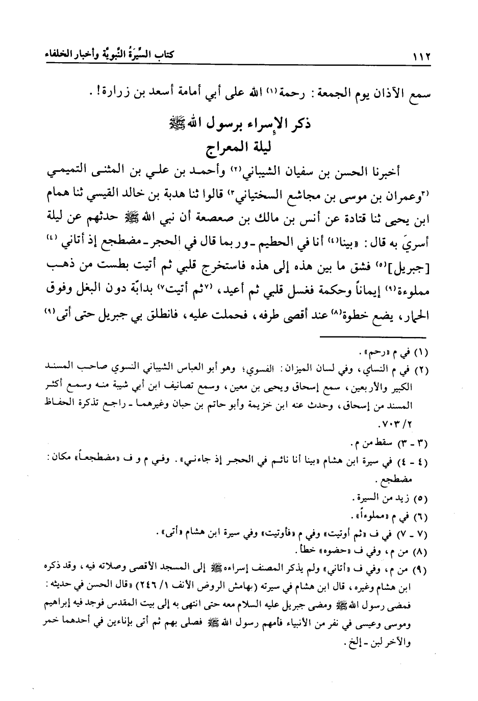 أخبرنا الحسن بن سفيان الشيباني «2» وأحمد بن علي بن المثنى التميمي «3» وعمران بن موسى بن مجاشع السختياني «3» قالوا ثنا هدبة بن خالد القيسي ثنا همام ابن يحيى ثنا قتادة عن أنس بن مالك بن صعصعة أن نبي الله صلى الله عليه وسلم حدثهم عن ليلة أسري به قال: «بينا «4» أنا في الحطيم- وربما قال في الحجر- مضطجع إذ أتاني «4» [جبريل] «5» فشق ما بين هذه إلى هذه فاستخرج قلبي ثم أتيت بطست من ذهب مملوءة «6» إيمانا وحكمة فغسل قلبي ثم أعيد، «7» ثم أتيت «7» بدابّة دون البغل وفوق الحمار، يضع خطوة «8» عند أقصى طرفه، فحملت عليه، فانطلق بي جبريل حتى أتى «9»