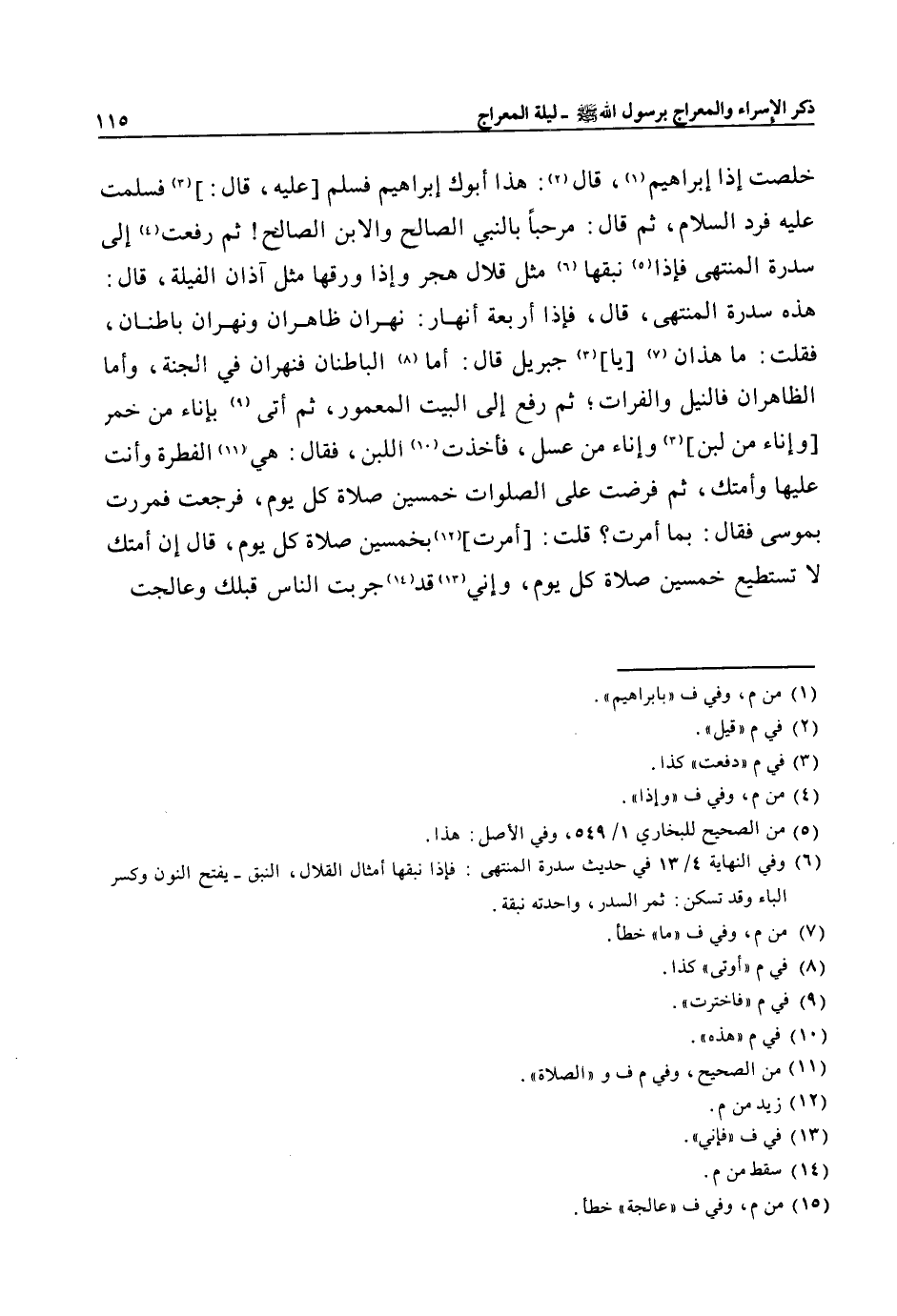 هذه سدرة المنتهى، قال، فإذا أربعة أنهار: نهران ظاهران ونهران باطنان، فقلت: ما هذان «7» [يا] «3» جبريل قال: أما «8» الباطنان فنهران في الجنة، وأما الظاهران فالنيل والفرات؛ ثم رفع إلى البيت المعمور، ثم أتى «9» بإناء من خمر [وإناء من لبن] «3» وإناء من عسل، فأخذت «10» اللبن، فقال: هي «11» الفطرة وأنت عليها وأمتك، ثم فرضت على الصلوات خمسين صلاة كل يوم، فرجعت فمررت بموسى فقال: بما أمرت؟ قلت: [أمرت] «12» بخمسين صلاة كل يوم، قال إن أمتك لا تستطيع خمسين صلاة كل يوم، وإني «13» قد1»