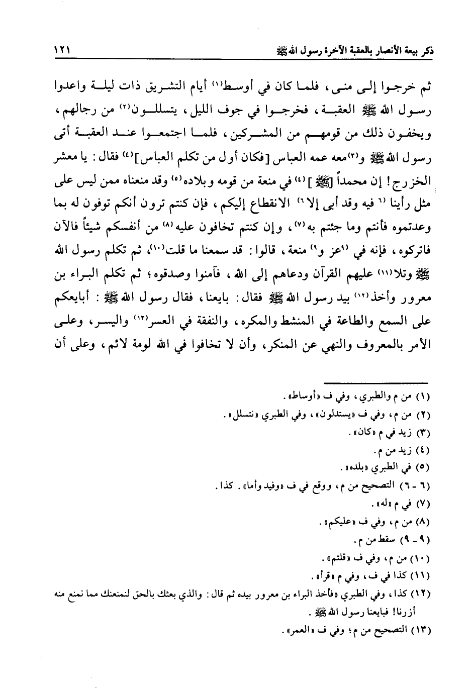 (12) كذا، وفي الطبري «فأخذ البراء بن معرور بيده ثم قال: والذي بعثك بالحق لنمنعنك مما نمنع منه أزرنا! فبايعنا رسول الله صلى الله عليه وسلم.
