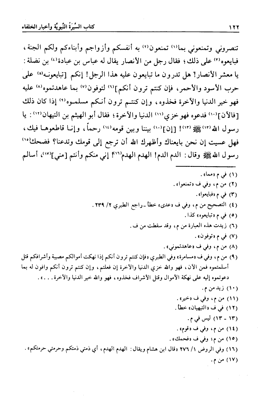 يا معشر الأنصار! هل تدرون ما تبايعون عليه هذا الرجل! إنكم [تبايعونه «5» على حرب الأسود والأحمر، فإن كنتم ترون أنكم] «6» لتوفون «7» بما عاهدتموه «8» عليه فهو خير الدنيا والآخرة فخذوه، وإن كنتم ترون أنكم مسلموه «9» إذا كان ذلك [فالآن] «10» فدعوه فهو خزي «11» الدنيا والآخرة؛ فقال أبو الهيثم بن التيهان «12» : يا رسول الله «13» صلى الله عليه وسلم «13» ! [إن] «10» بيننا وبين قومه «14» رحما، وإنا قاطعوها فيك، فهل عسيت إن نحن بايعناك وأظهرك الله أن ترجع إلى قومك وتدعنا؟ فضحك «15» رسول الله صلى الله عليه وسلم وقال: الدم الدم! الهدم الهدم «16» ! إني منكم وأنتم [مني] «17» ، أسالم