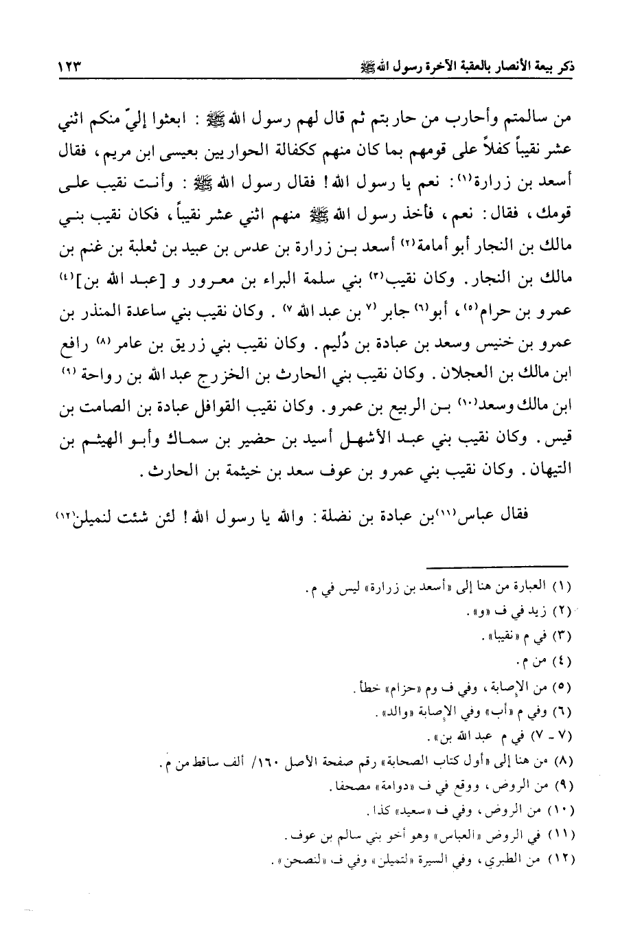 بني سلمة البراء بن معرور و [عبد الله بن] «4» عمرو بن حرام «5» ، أبو «6» جابر «7» بن عبد الله «7» . وكان نقيب بني ساعدة المنذر بن عمرو بن خنيس وسعد بن عبادة بن دليم. وكان نقيب بني زريق بن عامر «8» رافع ابن مالك بن العجلان. وكان نقيب بني الحارث بن الخزرج عبد الله بن رواحة «9» ابن مالك وسعد «10» بن الربيع بن عمرو. وكان نقيب القوافل عبادة بن الصامت بن قيس. وكان نقيب بني عبد الأشهل أسيد بن حضير بن سماك وأبو الهيثم بن التيهان. وكان نقيب بني عمرو بن عوف سعد بن خيثمة بن الحارث.