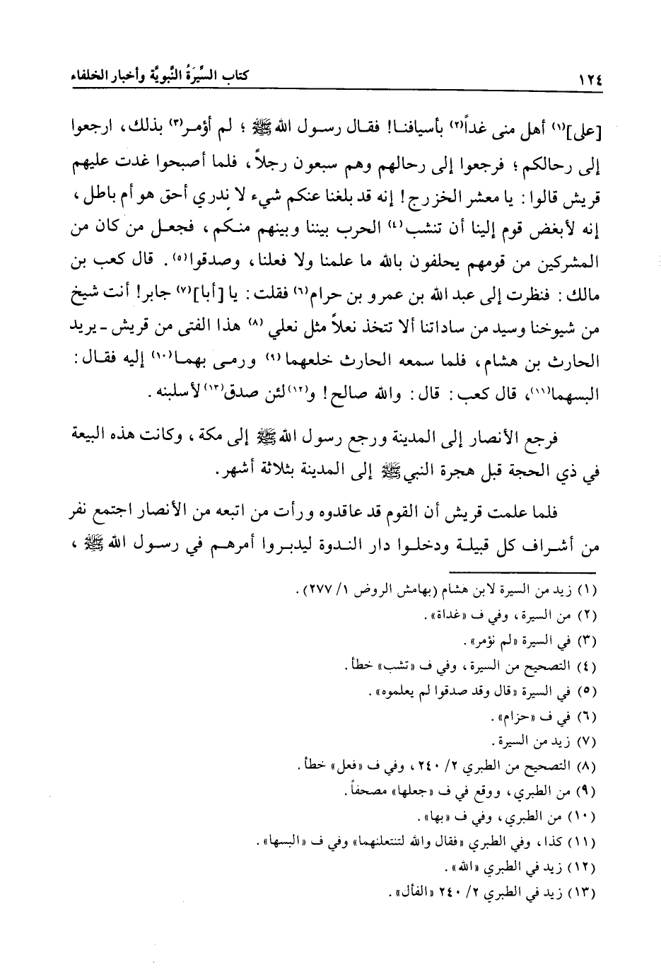 [على] «1» أهل منى غدا «2» بأسيافنا! فقال رسول الله صلى الله عليه وسلم؛ لم أؤمر «3» بذلك، ارجعوا إلى رحالكم؛ فرجعوا إلى رحالهم وهم سبعون رجلا، فلما أصبحوا غدت عليهم قريش قالوا: يا معشر الخزرج! إنه قد بلغنا عنكم شيء لا ندري أحق هو أم باطل، إنه لأبغض قوم إلينا أن تنشب «4» الحرب بيننا وبينهم منكم، فجعل من كان من المشركين من قومهم يحلفون بالله ما علمنا ولا فعلنا، وصدقوا «5» . قال كعب بن مالك: فنظرت إلى عبد الله بن عمرو بن حرام «6» فقلت: يا [أبا] «7» جابر! أنت شيخ من شيوخنا وسيد من ساداتنا ألا تتخذ نعلا مثل نعلي «8» هذا الفتى من قريش- يريد الحارث بن هشام، فلما سمعه الحارث خلعهما «9» ورمى بهما «10» إليه فقال:
