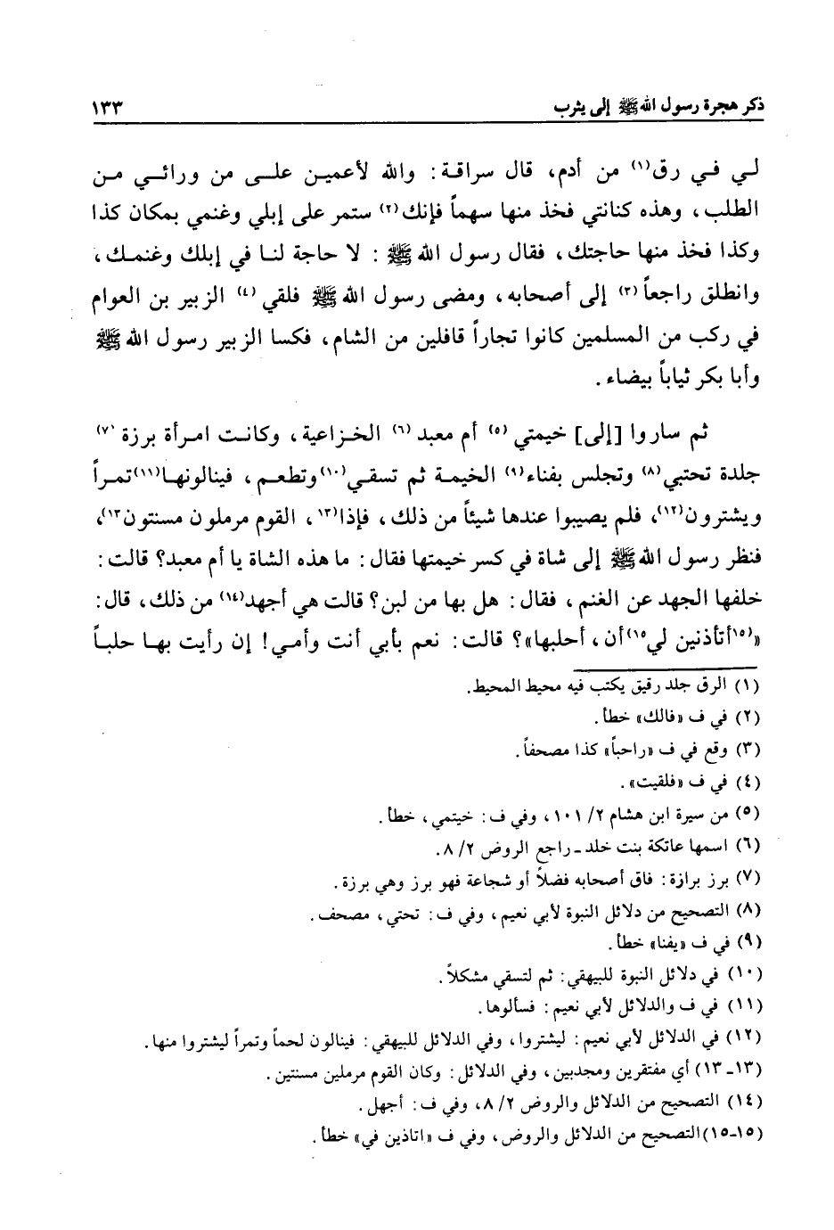 ثم ساروا [إلى] خيمتي «5» أم معبد «6» الخزاعية، وكانت امرأة برزة «7» جلدة تحتبي «8» وتجلس بفناء «9» الخيمة ثم تسقي «10» وتطعم، فينالونها «11» تمرا ويشترون «12» ، فلم يصيبوا عندها شيئا من ذلك، فإذا «13» ، القوم مرملون مسنتون «13» ، فنظر رسول الله صلى الله عليه وسلم إلى شاة في كسر خيمتها فقال: ما هذه الشاة يا أم معبد؟ قالت:
