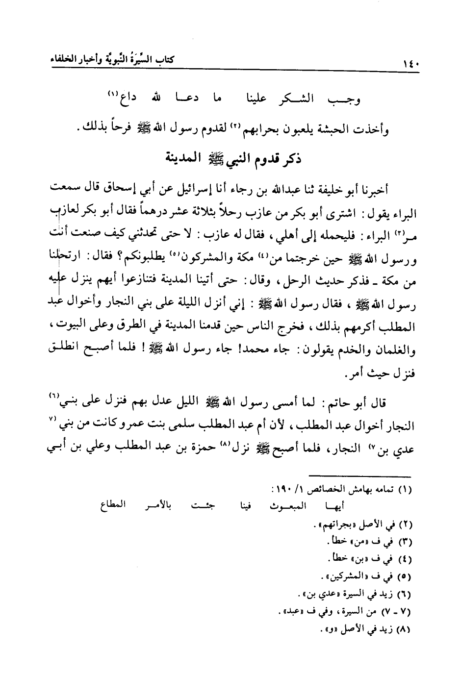 أخبرنا أبو خليفة ثنا عبد الله بن رجاء أنا إسرائيل عن أبي إسحاق قال سمعت البراء يقول: اشترى أبو بكر من عازب رحلا بثلاثة عشر درهما فقال أبو بكر لعازب مر «3» البراء: فليحمله إلى أهلي، فقال له عازب: لا حتى تحدثني كيف صنعت أنت ورسول الله صلى الله عليه وسلم حين خرجتما من «4» مكة والمشركون «5» يطلبونكم؟ فقال: ارتحلنا من مكة- فذكر حديث الرحل، وقال: حتى أتينا المدينة فتنازعوا أيهم ينزل عليه رسول الله صلى الله عليه وسلم، فقال رسول الله صلى الله عليه وسلم: إني أنزل الليلة على بني النجار وأخوال عبد المطلب أكرمهم بذلك، فخرج الناس حين قدمنا المدينة في الطرق وعلى البيوت، والغلمان والخدم يقولون: جاء محمد! جاء رسول الله صلى الله عليه وسلم! فلما أصبح انطلق فنزل حيث أمر.
