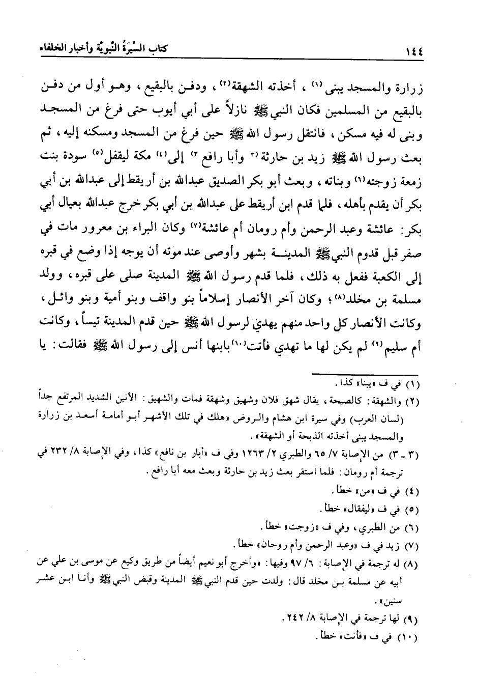 زرارة والمسجد يبنى «1» ، أخذته الشهقة «2» ، ودفن بالبقيع، وهو أول من دفن بالبقيع من المسلمين فكان النبي صلى الله عليه وسلم نازلا على أبي أيوب حتى فرغ من المسجد وبنى له فيه مسكن، فانتقل رسول الله صلى الله عليه وسلم حين فرغ من المسجد ومسكنه إليه، ثم بعث رسول الله صلى الله عليه وسلم زيد بن حارثة «3» وأبا رافع «3» إلى «4» مكة ليقفل «5» سودة بنت زمعة زوجته «6» وبناته، وبعث أبو بكر الصديق عبد الله بن أريقط إلى عبد الله بن أبي بكر أن يقدم بأهله، فلما قدم ابن أريقط على عبد الله بن أبي بكر خرج عبد الله بعيال أبي بكر: عائشة وعبد الرحمن وأم رومان أم عائشة «7» وكان البراء بن معرور مات في صفر قبل قدوم النبي صلى الله عليه وسلم المدينة بشهر وأوصى عند موته أن يوجه إذا وضع في قبره إلى الكعبة ففعل به ذلك، فلما قدم رسول الله صلى الله عليه وسلم المدينة صلى على قبره، وولد مسلمة بن مخلد «8» ؛ وكان آخر الأنصار إسلاما بنو واقف وبنو أمية وبنو وائل، وكانت الأنصار كل واحد منهم يهدي لرسول الله صلى الله عليه وسلم حين قدم المدينة تيسا، وكانت أم سليم «9» لم يكن لها ما تهدي فأتت «10» بابنها أنس إلى رسول الله صلى الله عليه وسلم فقالت: يا