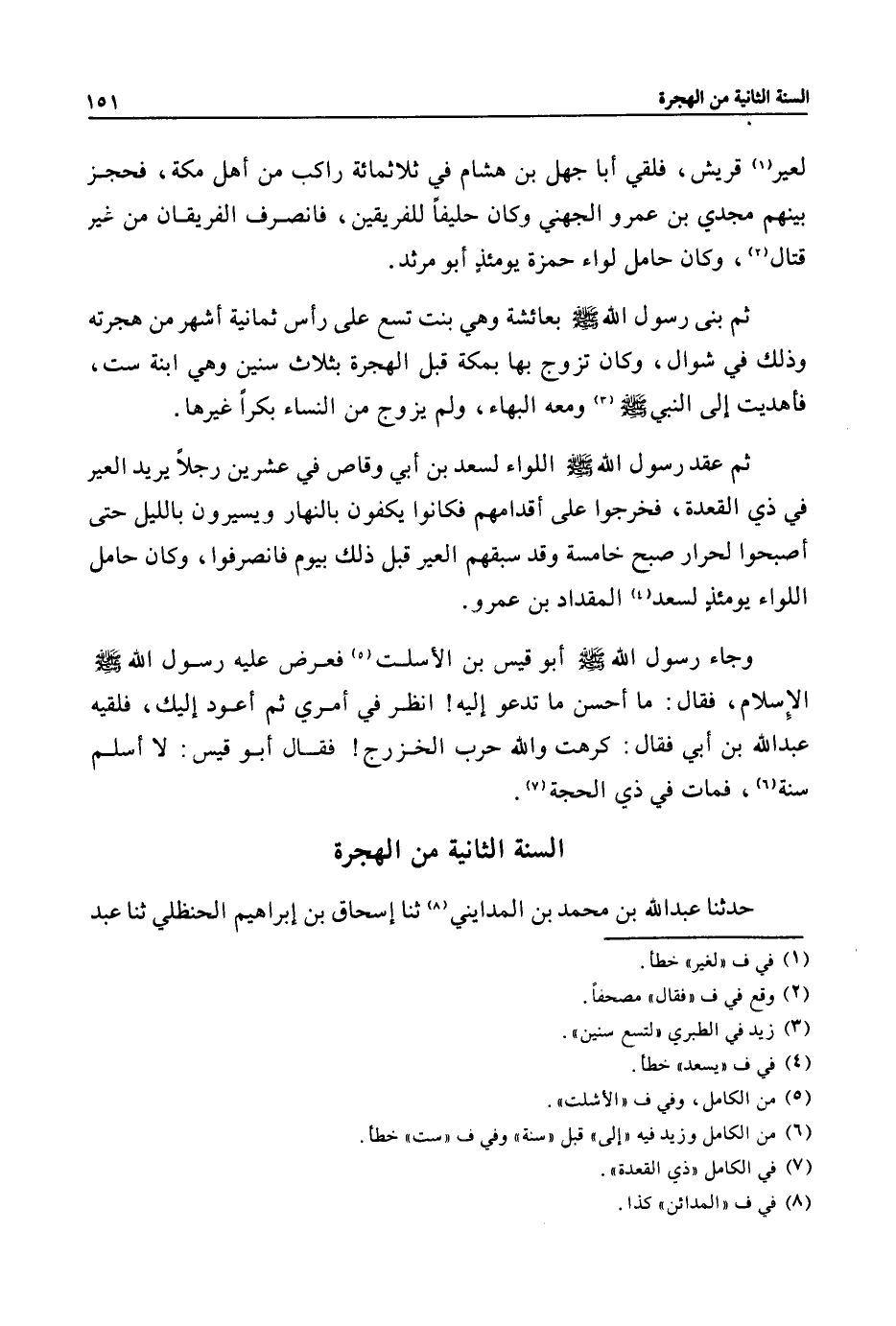ثم عقد رسول الله صلى الله عليه وسلم اللواء لسعد بن أبي وقاص في عشرين رجلا يريد العير في ذي القعدة، فخرجوا على أقدامهم فكانوا يكفون بالنهار ويسيرون بالليل حتى أصبحوا لحرار صبح خامسة وقد سبقهم العير قبل ذلك بيوم فانصرفوا، وكان حامل اللواء يومئذ لسعد «4» المقداد بن عمرو.