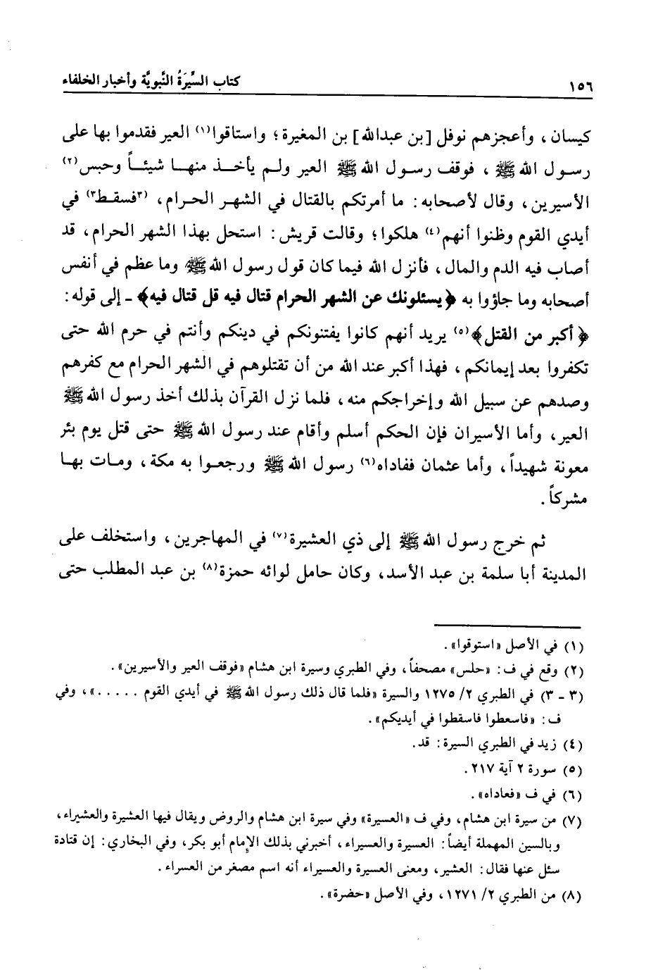 (7) من سيرة ابن هشام، وفي ف «العسيرة» وفي سيرة ابن هشام والروض ويقال فيها العشيرة والعشيراء، وبالسين المهملة أيضا: العسيرة والعسيراء، أخبرني بذلك الإمام أبو بكر، وفي البخاري: إن قتادة سئل عنها فقال: العشير، ومعنى العسيرة والعسيراء أنه اسم مصغر من العسراء.