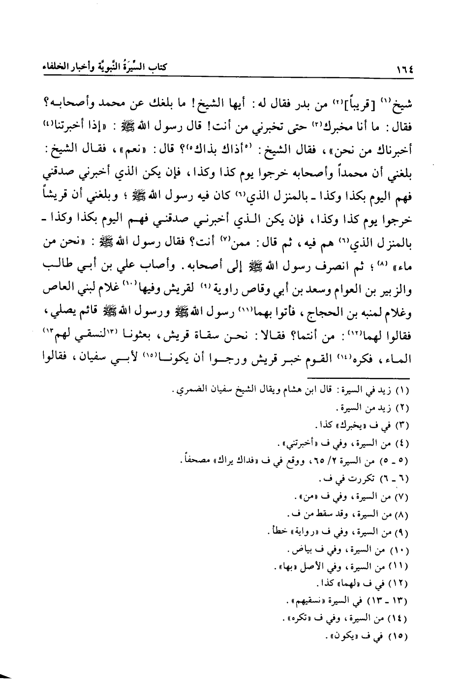 بلغني أن محمدا وأصحابه خرجوا يوم كذا وكذا، فإن يكن الذي أخبرني صدقني فهم اليوم بكذا وكذا- بالمنزل الذي «6» كان فيه رسول الله صلى الله عليه وسلم؛ وبلغني أن قريشا خرجوا يوم كذا وكذا، فإن يكن الذي أخبرني صدقني فهم اليوم بكذا وكذا- بالمنزل الذي «6» هم فيه، ثم قال: ممن «7» أنت؟ فقال رسول الله صلى الله عليه وسلم: «نحن من ماء» «8» ؛ ثم انصرف رسول الله صلى الله عليه وسلم إلى أصحابه. وأصاب علي بن أبي طالب والزبير بن العوام وسعد بن أبي وقاص راوية «9» لقريش وفيها «10» غلام لبني العاص وغلام لمنبه بن الحجاج، فأتوا بهما «11» رسول الله صلى الله عليه وسلم ورسول الله صلى الله عليه وسلم قائم يصلي، فقالوا لهما «12» : من أنتما؟ فقالا: نحن سقاة قريش، بعثونا «13» لنسقي لهم «13» الماء، فكره «14» القوم خبر قريش ورجوا أن يكونا «15» لأبي سفيان، فقالوا