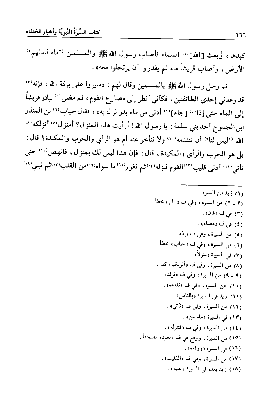 بل هو الحرب والرأي والمكيدة، قال: فإن هذا ليس لك بمنزل، فانهض «11» حتى نأتي «12» أدنى قليب «13» القوم فنزله «14» ثم نغور «15» ما سواه «16» من القلب «17» ثم نبني «18»