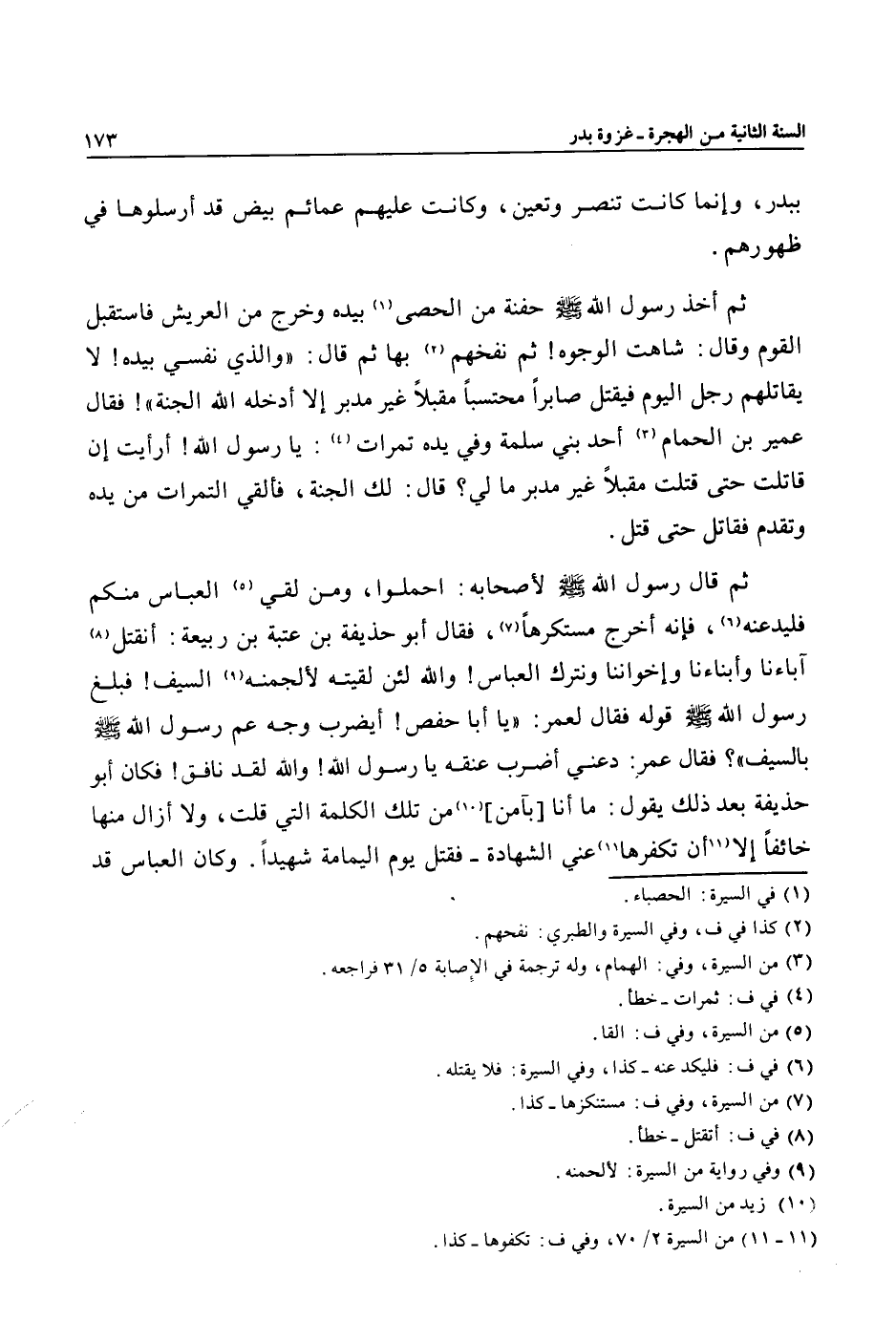 ثم أخذ رسول الله صلى الله عليه وسلم حفنة من الحصى «1» بيده وخرج من العريش فاستقبل القوم وقال: شاهت الوجوه! ثم نفخهم «2» بها ثم قال: «والذي نفسي بيده! لا يقاتلهم رجل اليوم فيقتل صابرا محتسبا مقبلا غير مدبر إلا أدخله الله الجنة» ! فقال عمير بن الحمام «3» أحد بني سلمة وفي يده تمرات «4» : يا رسول الله! أرأيت إن قاتلت حتى قتلت مقبلا غير مدبر ما لي؟ قال: لك الجنة، فألقي التمرات من يده وتقدم فقاتل حتى قتل.