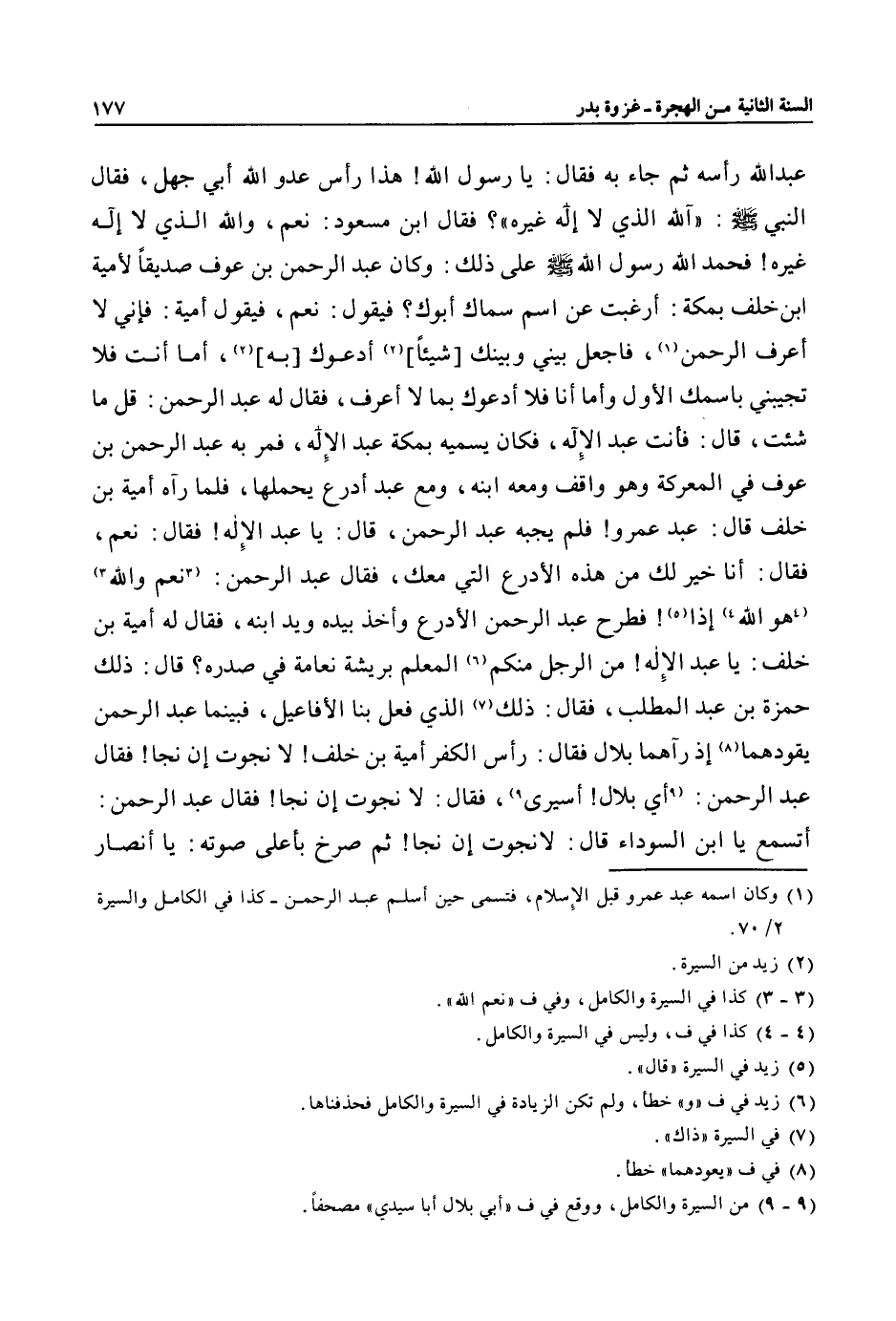 عبد الله رأسه ثم جاء به فقال: يا رسول الله! هذا رأس عدو الله أبي جهل، فقال النبي صلى الله عليه وسلم: «آلله الذي لا إله غيره» ؟ فقال ابن مسعود: نعم، والله الذي لا إله غيره! فحمد الله رسول الله صلى الله عليه وسلم على ذلك: وكان عبد الرحمن بن عوف صديقا لأمية ابن خلف بمكة: أرغبت عن اسم سماك أبوك؟ فيقول: نعم، فيقول أمية: فإني لا أعرف الرحمن «1» ، فاجعل بيني وبينك [شيئا] «2» أدعوك [به] «2» ، أما أنت فلا تجيبني باسمك الأول وأما أنا فلا أدعوك بما لا أعرف، فقال له عبد الرحمن: قل ما شئت، قال: فأنت عبد الإله، فكان يسميه بمكة عبد الإله، فمر به عبد الرحمن بن عوف في المعركة وهو واقف ومعه ابنه، ومع عبد أدرع يحملها، فلما رآه أمية بن خلف قال: عبد عمرو! فلم يجبه عبد الرحمن، قال: يا عبد الإله! فقال: نعم، فقال: أنا خير لك من هذه الأدرع التي معك، فقال عبد الرحمن: «3» نعم والله «3» «4» هو الله «4» إذا «5» ! فطرح عبد الرحمن الأدرع وأخذ بيده ويد ابنه، فقال له أمية بن خلف: يا عبد الإله! من الرجل منكم «6» المعلم بريشة نعامة في صدره؟ قال: ذلك حمزة بن عبد المطلب، فقال: ذلك «7» الذي فعل بنا الأفاعيل، فبينما عبد الرحمن يقودهما «8» إذ رآهما بلال فقال: رأس الكفر أمية بن خلف! لا نجوت إن نجا! فقال عبد الرحمن: «9» أي بلال! أسيرى «9» ، فقال: لا نجوت إن نجا! فقال عبد الرحمن:
