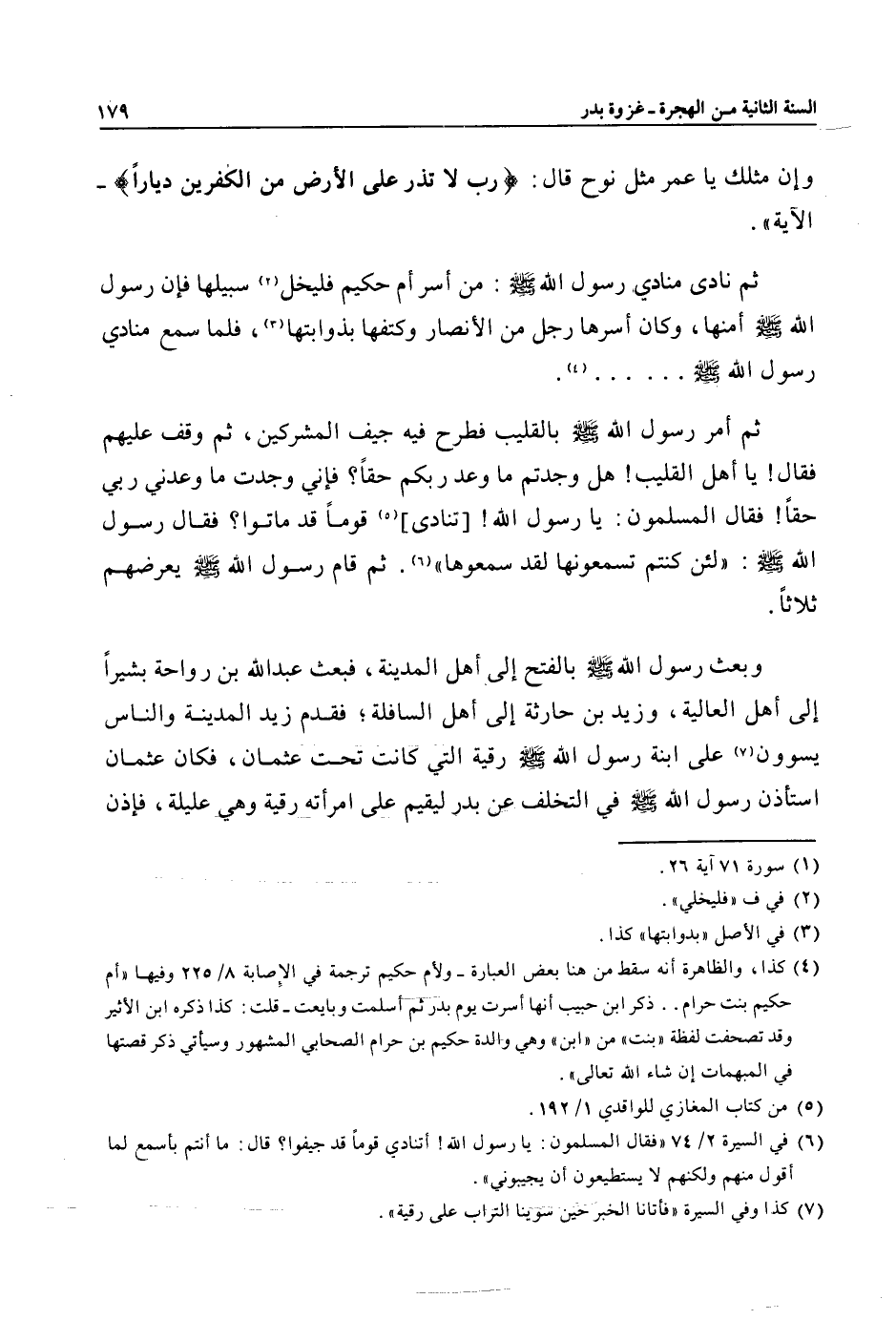 (6) في السيرة 2/ 74 «فقال المسلمون: يا رسول الله! أتنادي قوما قد جيفوا؟ قال: ما أنتم بأسمع لما أقول منهم ولكنهم لا يستطيعون أن يجيبوني» .