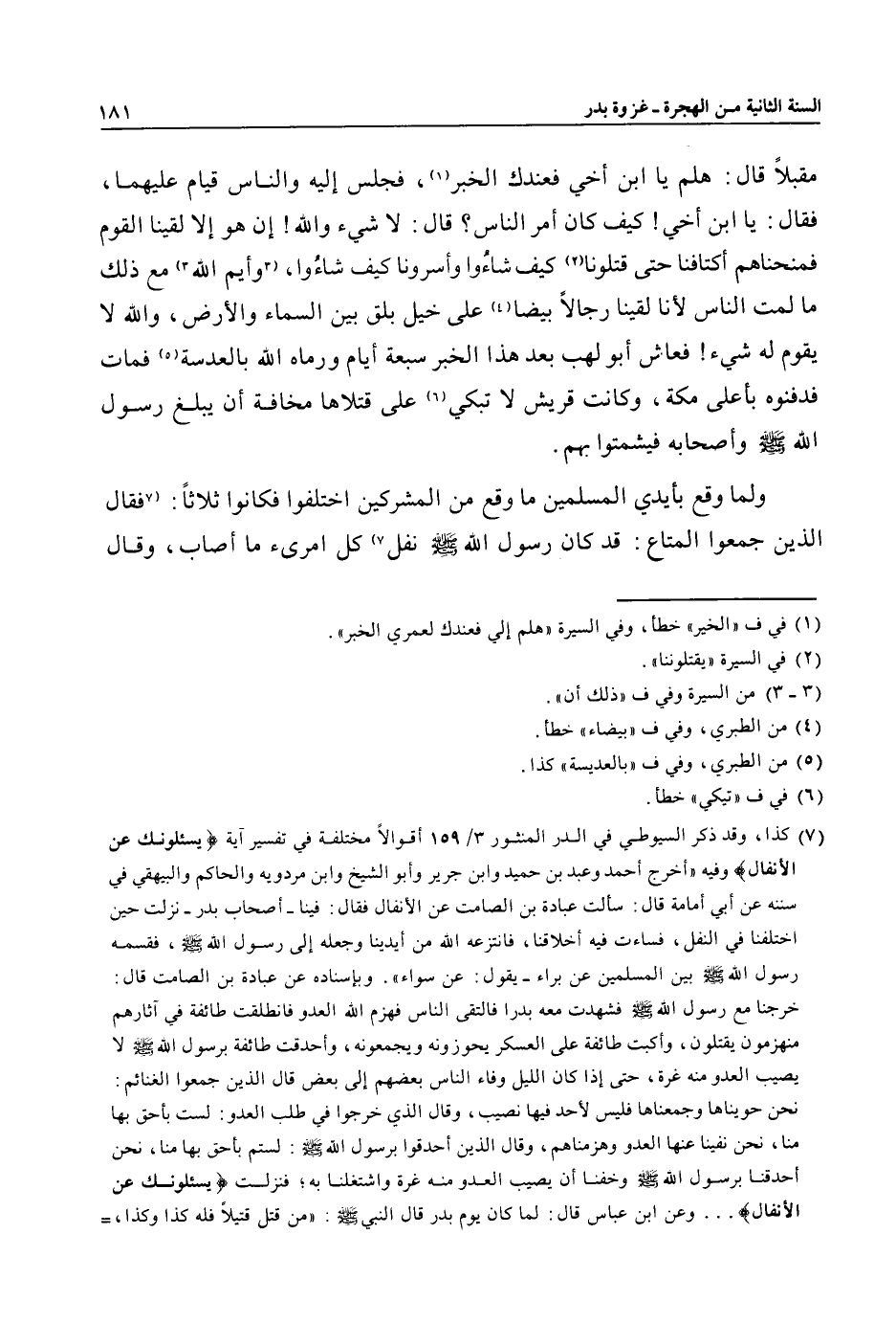 (7) كذا، وقد ذكر السيوطي في الدر المنثور 3/ 159 أقوالا مختلفة في تفسير آية يَسْئَلُونَكَ عَنِ الْأَنْفالِ وفيه «أخرج أحمد وعبد بن حميد وابن جرير وأبو الشيخ وابن مردويه والحاكم والبيهقي في سننه عن أبي أمامة قال: سألت عبادة بن الصامت عن الأنفال فقال: فينا- أصحاب بدر- نزلت حين اختلفنا في النفل، فساءت فيه أخلاقنا، فانتزعه الله من أيدينا وجعله إلى رسول الله صلى الله عليه وسلم، فقسمه رسول الله صلى الله عليه وسلم بين المسلمين عن براء- يقول: عن سواء» . وبإسناده عن عبادة بن الصامت قال: خرجنا مع رسول الله صلى الله عليه وسلم فشهدت معه بدرا فالتقى الناس فهزم الله العدو فانطلقت طائفة في آثارهم منهزمون يقتلون، وأكبت طائفة على العسكر يحوزونه ويجمعونه، وأحدقت طائفة برسول الله صلى الله عليه وسلم لا يصيب العدو منه غرة، حتى إذا كان الليل وفاء الناس بعضهم إلى بعض قال الذين جمعوا الغنائم: نحن حويناها وجمعناها فليس لأحد فيها نصيب، وقال الذي خرجوا في طلب العدو: لست بأحق بها منا، نحن نفينا عنها العدو وهزمناهم، وقال الذين أحدقوا برسول الله صلى الله عليه وسلم: لستم بأحق بها منا، نحن أحدقنا برسول الله صلى الله عليه وسلم وخفنا أن يصيب العدو منه غرة واشتغلنا به؛ فنزلت يَسْئَلُونَكَ عَنِ الْأَنْفالِ ... وعن ابن عباس قال: لما كان يوم بدر قال النبي صلى الله عليه وسلم: «من قتل قتيلا فله كذا وكذا،