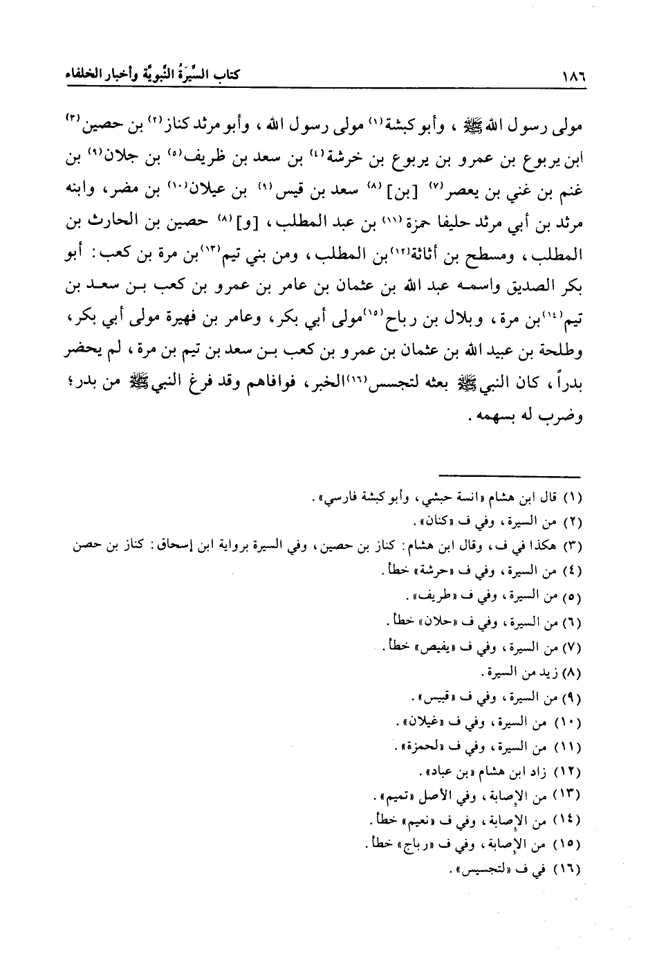 مولى رسول الله صلى الله عليه وسلم، وأبو كبشة «1» مولى رسول الله، وأبو مرثد كناز «2» بن حصين «3» ابن يربوع بن عمرو بن يربوع بن خرشة «4» بن سعد بن ظريف «5» بن جلان «6» بن غنم بن غني بن يعصر «7» [بن] «8» سعد بن قيس «9» بن عيلان «10» بن مضر، وابنه مرثد بن أبي مرثد حليفا حمزة «11» بن عبد المطلب، [و] «8» حصين بن الحارث بن المطلب، ومسطح بن أثاثة «12» بن المطلب، ومن بني تيم «13» بن مرة بن كعب: أبو بكر الصديق واسمه عبد الله بن عثمان بن عامر بن عمرو بن كعب بن سعد بن تيم «14» بن مرة، وبلال بن رباح «15» مولى أبي بكر، وعامر بن فهيرة مولى أبي بكر، وطلحة بن عبيد الله بن عثمان بن عمرو بن كعب بن سعد بن تيم بن مرة، لم يحضر بدرا، كان النبي صلى الله عليه وسلم بعثه لتجسس «16» الخبر، فوافاهم وقد فرغ النبي صلى الله عليه وسلم من بدر؛ وضرب له بسهمه.