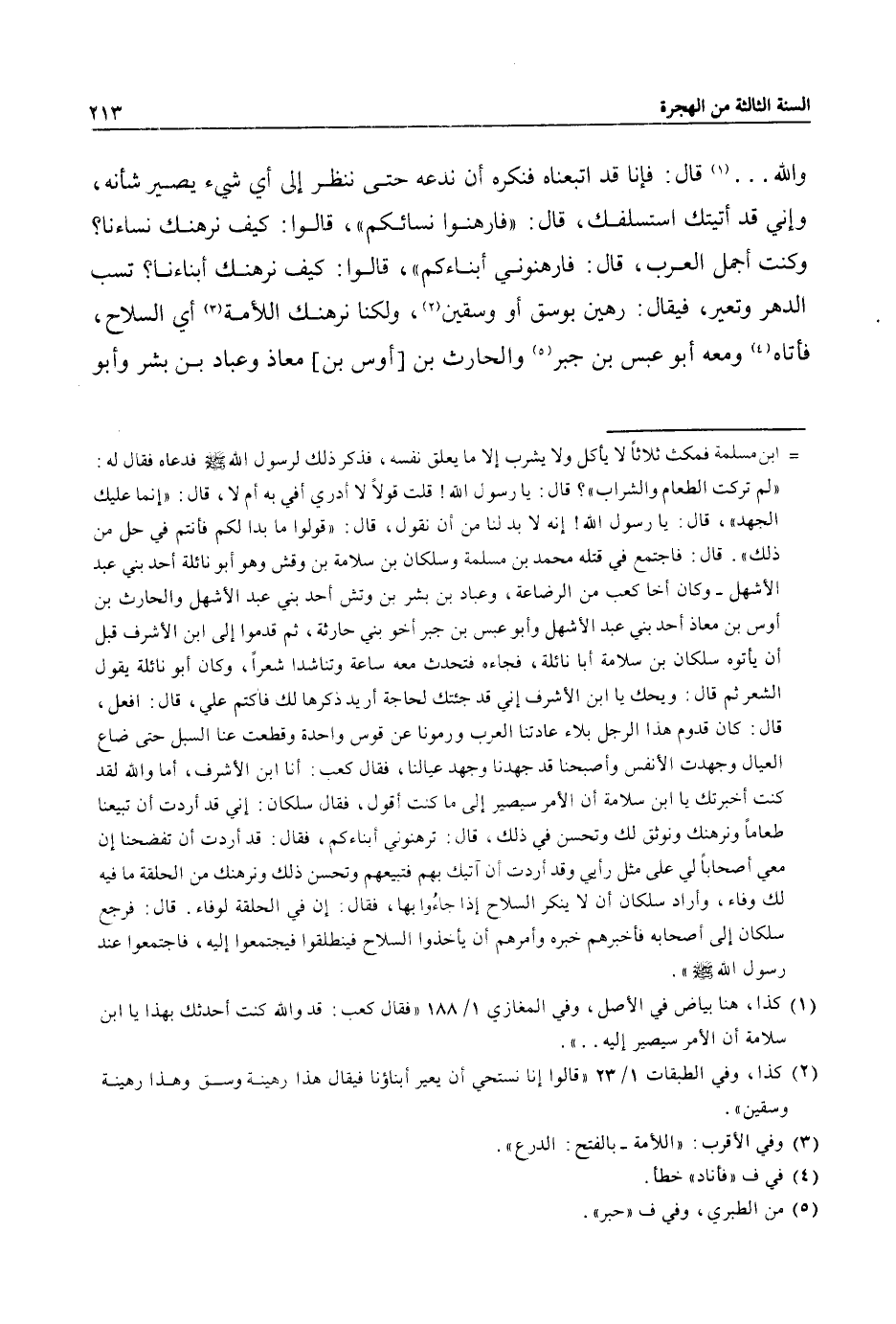 ابن مسلمة فمكث ثلاثا لا يأكل ولا يشرب إلا ما يعلق نفسه، فذكر ذلك لرسول الله صلى الله عليه وسلم فدعاه فقال له: «لم تركت الطعام والشراب» ؟ قال: يا رسول الله! قلت قولا لا أدري أفي به أم لا، قال: «إنما عليك الجهد» ، قال: يا رسول الله! إنه لا بد لنا من أن نقول، قال: «قولوا ما بدا لكم فأنتم في حل من ذلك» . قال: فاجتمع في قتله محمد بن مسلمة وسلكان بن سلامة بن وقش وهو أبو نائلة أحد بني عبد الأشهل- وكان أخا كعب من الرضاعة، وعباد بن بشر بن وتش أحد بني عبد الأشهل والحارث بن أوس بن معاذ أحد بني عبد الأشهل وأبو عبس بن جبر أخو بني حارثة، ثم قدموا إلى ابن الأشرف قبل أن يأتوه سلكان بن سلامة أبا نائلة، فجاءه فتحدث معه ساعة وتناشدا شعرا، وكان أبو نائلة يقول الشعر ثم قال: ويحك يا ابن الأشرف إني قد جئتك لحاجة أريد ذكرها لك فأكتم علي، قال: افعل، قال: كان قدوم هذا الرجل بلاء عادتنا العرب ورمونا عن قوس واحدة وقطعت عنا السبل حتى ضاع العيال وجهدت الأنفس وأصبحنا قد جهدنا وجهد عيالنا، فقال كعب: أنا ابن الأشرف، أما والله لقد كنت أخبرتك يا ابن سلامة أن الأمر سيصير إلى ما كنت أقول، فقال سلكان: إني قد أردت أن تبيعنا طعاما ونرهنك ونوثق لك وتحسن في ذلك، قال: ترهنوني أبناءكم، فقال: قد أردت أن تفضحنا إن معي أصحابا لي على مثل رأيي وقد أردت أن آتيك بهم فتبيعهم وتحسن ذلك ونرهنك من الحلقة ما فيه لك وفاء، وأراد سلكان أن لا ينكر السلاح إذا جاءوا بها، فقال: إن في الحلقة لوفاء. قال: فرجع سلكان إلى أصحابه فأخبرهم خبره وأمرهم أن يأخذوا السلاح فينطلقوا فيجتمعوا إليه، فاجتمعوا عند رسول الله صلى الله عليه وسلم» .