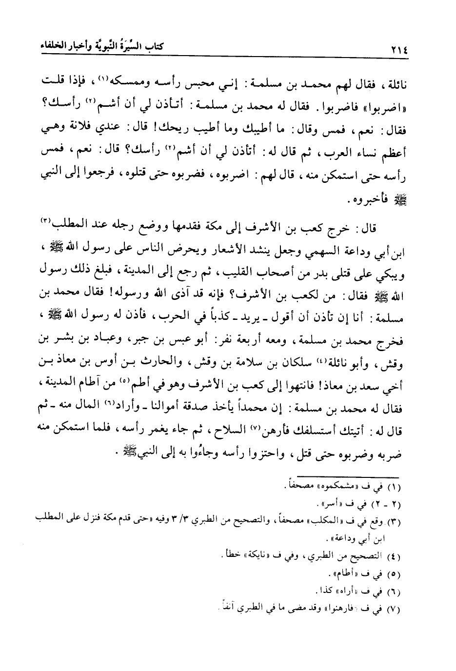 نائلة، فقال لهم محمد بن مسلمة: إني محبس رأسه وممسكه «1» ، فإذا قلت «اضربوا» فاضربوا. فقال له محمد بن مسلمة: أتأذن لي أن أشم «2» رأسك؟
