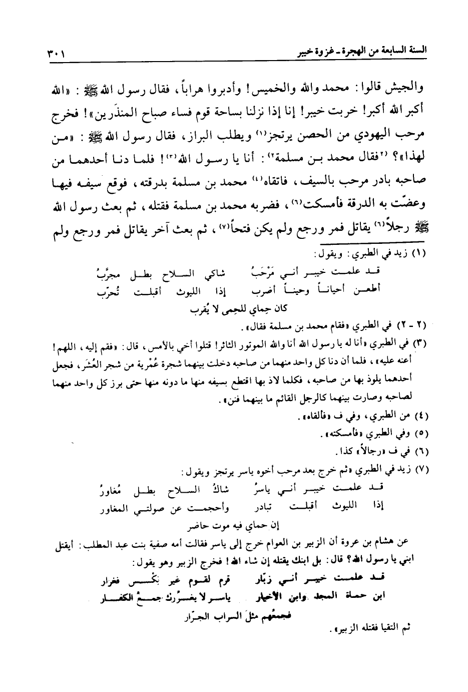 (7) زيد في الطبري «ثم خرج بعد مرحب أخوه ياسر يرتجز ويقول: