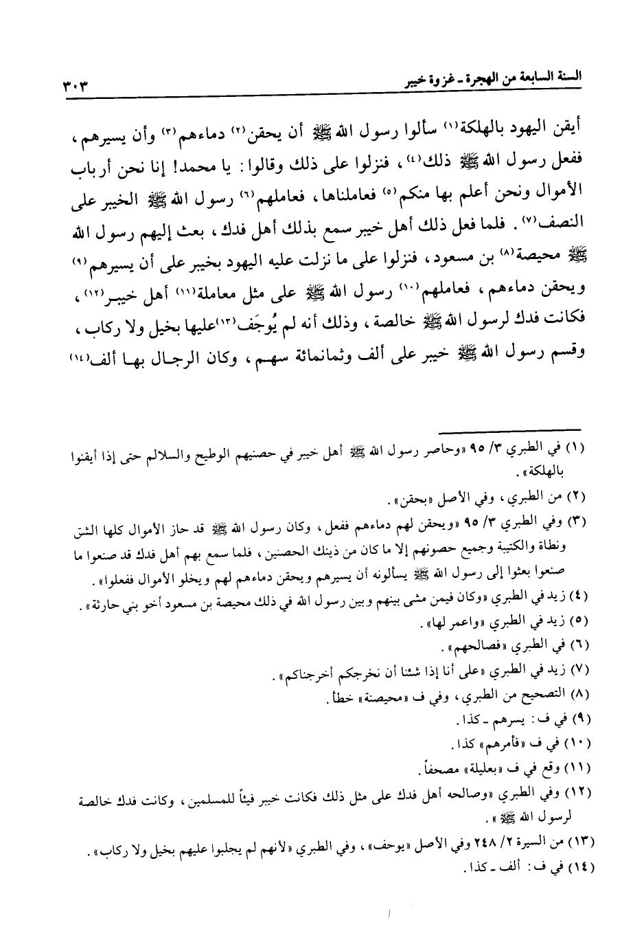 (3) وفي الطبري 3/ 95 «ويحقن لهم دماءهم ففعل، وكان رسول الله صلى الله عليه وسلم قد حاز الأموال كلها الشق ونطاة والكتيبة وجميع حصونهم إلا ما كان من ذينك الحصنين، فلما سمع بهم أهل فدك قد صنعوا ما صنعوا بعثوا إلى رسول الله صلى الله عليه وسلم يسألونه أن يسيرهم ويحقن دماءهم لهم ويخلوا الأموال ففعلوا» .
