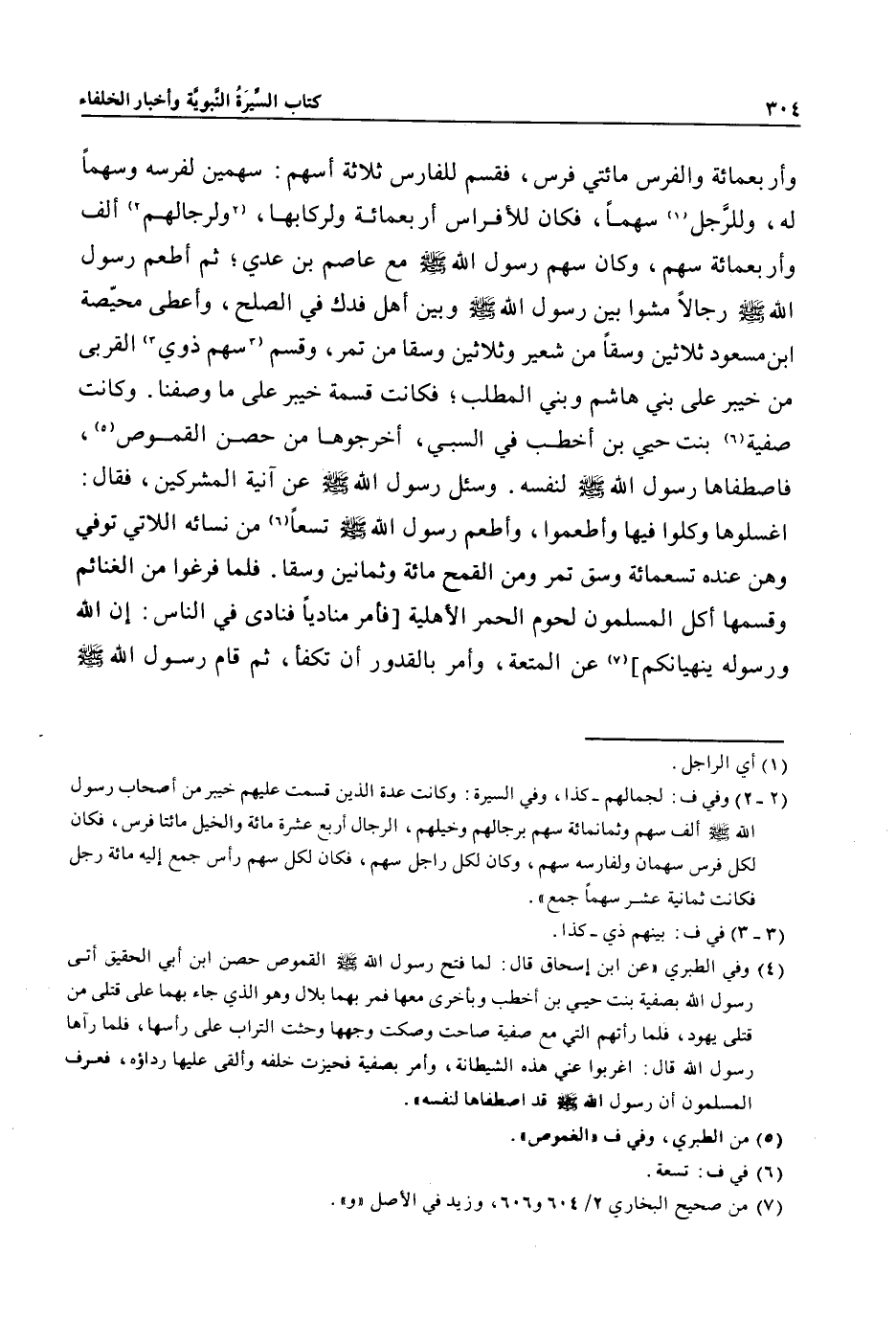 (4) وفي الطبري «عن ابن إسحاق قال: لما فتح رسول الله صلى الله عليه وسلم القموص حصن ابن أبي الحقيق أتى رسول الله بصفية بنت حيي بن أخطب وبأخرى معها فمر بهما بلال وهو الذي جاء بهما على قتلى من قتلى يهود، فلما رأتهم التي مع صفية صاحت وصكت وجهها وحثت التراب على رأسها، فلما رآها رسول الله قال: اغربوا عني هذه الشيطانة، وأمر بصفية فحيزت خلفه وألقى عليها رداؤه، فعرف المسلمون أن رسول الله صلى الله عليه وسلم قد اصطفاها لنفسه» .