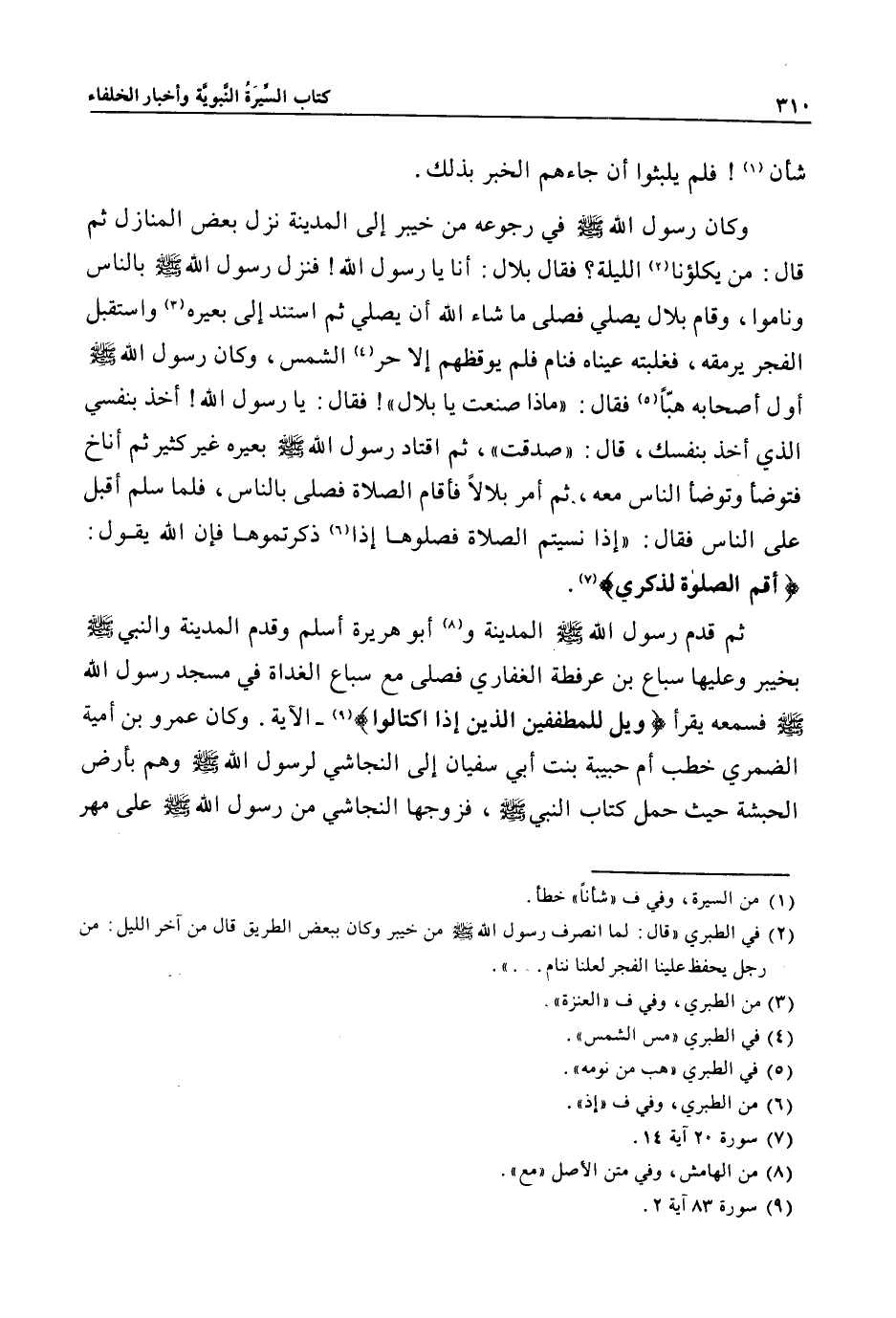 (2) في الطبري «قال: لما انصرف رسول الله صلى الله عليه وسلم من خيبر وكان ببعض الطريق قال من آخر الليل: من رجل يحفظ علينا الفجر لعلنا ننام ... » .