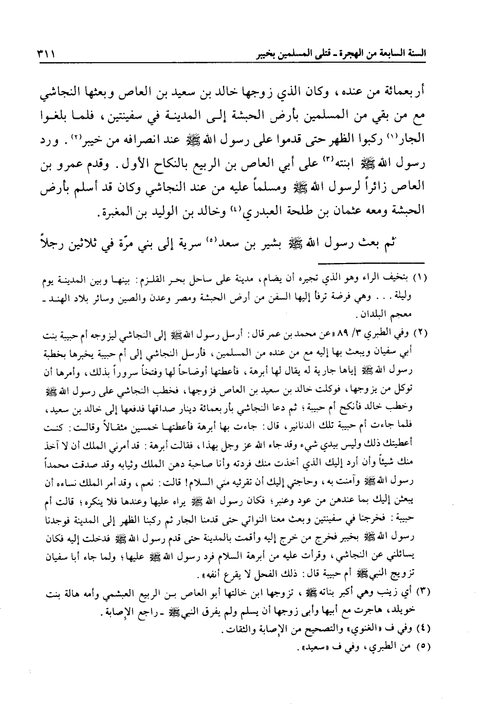أربعمائة من عنده، وكان الذي زوجها خالد بن سعيد بن العاص وبعثها النجاشي مع من بقي المسلمين بأرض الحبشة إلى المدينة في سفينتين، فلما بلغوا الجار «1» ركبوا الظهر حتى قدموا على رسول الله صلى الله عليه وسلم عند انصرافه من خيبر «2» . ورد رسول الله صلى الله عليه وسلم ابنته «3» على أبي العاص بن الربيع بالنكاح الأول. وقدم عمرو بن العاص زائرا لرسول الله صلى الله عليه وسلم ومسلما عليه من عند النجاشي وكان قد أسلم بأرض الحبشة ومعه عثمان بن طلحة العبدري «4» وخالد بن الوليد بن المغبرة.