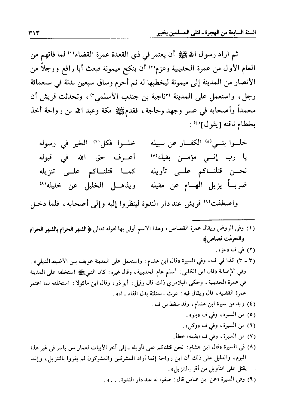 (8) في السيرة «قال ابن هشام: نحن قتلناكم على تأويله- إلى آخر الأبيات لعمار بن ياسر في غير هذا اليوم، والدليل على ذلك أن ابن رواحة إنما أراد المشركين والمشركون لم يقروا بالتنزيل، وإنما يقتل على التأويل من أقر بالتنزيل» .