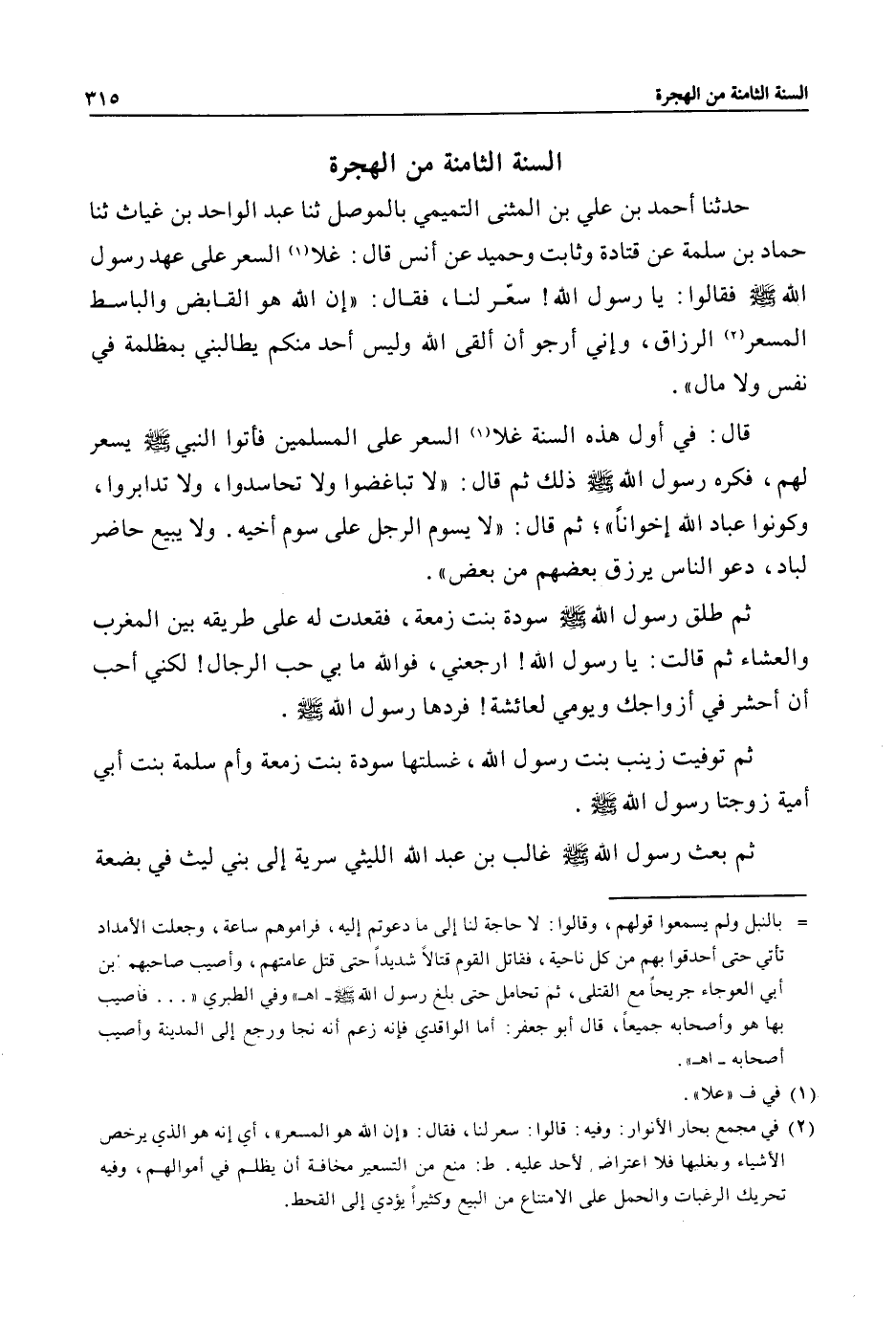 حدثنا أحمد بن علي بن المثنى التميمي بالموصل ثنا عبد الواحد بن غياث ثنا حماد بن سلمة عن قتادة وثابت وحميد عن أنس قال: غلا «1» السعر على عهد رسول الله صلى الله عليه وسلم فقالوا: يا رسول الله! سعّر لنا، فقال: «إن الله هو القابض والباسط المسعر «2» الرزاق، وإني أرجو أن ألقى الله وليس أحد منكم يطالبني بمظلمة في نفس ولا مال» .