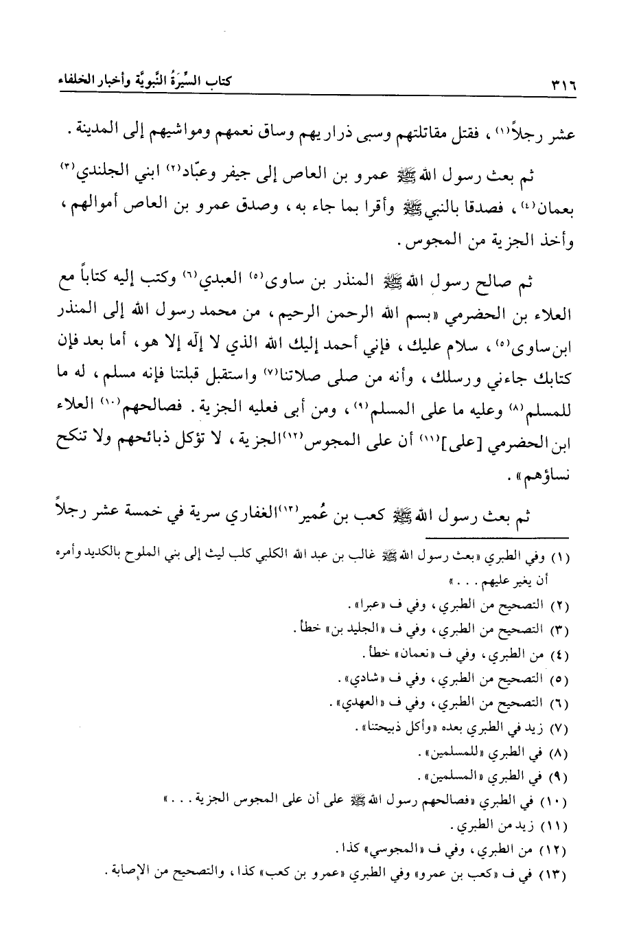 ثم صالح رسول الله صلى الله عليه وسلم المنذر بن ساوى «5» العبدي «6» وكتب إليه كتابا مع العلاء بن الحضرمي «بسم الله الرحمن الرحيم، من محمد رسول الله إلى المنذر ابن ساوى «5» ، سلام عليك، فإني أحمد إليك الله الذي لا إله إلا هو، أما بعد فإن كتابك جاءني ورسلك، وأنه من صلى صلاتنا «7» واستقبل قبلتنا فإنه مسلم، له ما للمسلم «8» وعليه ما على المسلم «9» ، ومن أبى فعليه الجزية. فصالحهم «10» العلاء ابن الحضرمي [على] «11» أن على المجوس «12» الجزية، لا تؤكل ذبائحهم ولا تنكح نساؤهم» .
