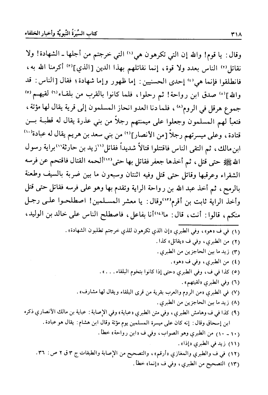 وقال: يا قوم! والله إن التي تكرهون هي «1» التي خرجتم من أجلها- الشهادة! ولا نقاتل «2» الناس بعدد ولا قوة، إنما نقاتلهم بهذا الدين [الذي] «3» أكرمنا الله به، فانطلقوا فإنما هي «4» إحدى الحسنيين: إما ظهور وإما شهادة؛ فقال [الناس: قد والله] «3» صدق ابن رواحة! ثم رحلوا، فلما كانوا بالقرب من بلقاء «5» لقيهم «6» جموع هرقل في الروم «7» ، فلما دنا العدو انحاز المسلمون إلى قرية يقال لها مؤتة، فتعبأ لهم المسلمون وجعلوا على ميمنتهم رجلا من بني عذرة يقال له قطبة بن قتادة، وعلى ميسرتهم رجلا [من الأنصار] «8» من بني سعد بن هريم يقال له عبادة «9» ابن مالك، ثم التقى الناس فاقتتلوا قتالا شديدا فقاتل «10» زيد بن حارثة «10» براية رسول الله صلى الله عليه وسلم حتى قتل، ثم أخذها جعفر فقاتل بها حتى «11» ألحمه القتال فاقتحم عن فرسه الشقراء وعرقبها وقاتل حتى قتل وفيه اثنتان وسبعون ما بين ضربة بالسيف وطعنة بالرمح، ثم أخذ عبد الله بن رواحة الراية وتقدم بها وهو على فرسه فقاتل حتى قتل وأخذ الراية ثابت بن أقرم «12» وقال: يا معشر المسلمين! اصطلحوا على رجل منكم، قالوا: أنت، قال: ما «13» أنا بفاعل، فاصطلح الناس على خالد بن الوليد،