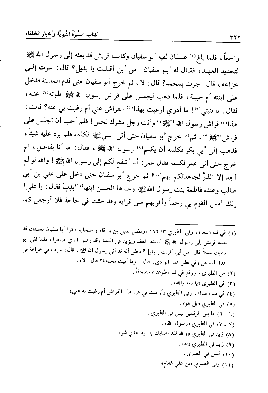راجعا، فلما بلغ «1» عسفان لقيه أبو سفيان وكانت قريش قد بعثه إلى رسول الله صلى الله عليه وسلم لتجديد العهد، فقال له أبو سفيان: من أين أقبلت يا بديل؟ قال: سرت إلى خزاعة، قال: جزت بمحمد؟ قال: لا، ثم خرج أبو سفيان حتى قدم المدينة فدخل على ابنته أم حبيبة، فلما ذهب ليجلس على فراش رسول الله صلى الله عليه وسلم طوته «2» عنه، فقال: يا بنيتي «3» ! ما أدري أرغبت بهذا «4» الفراش عني أم رغبت بي عنه؟ قالت: