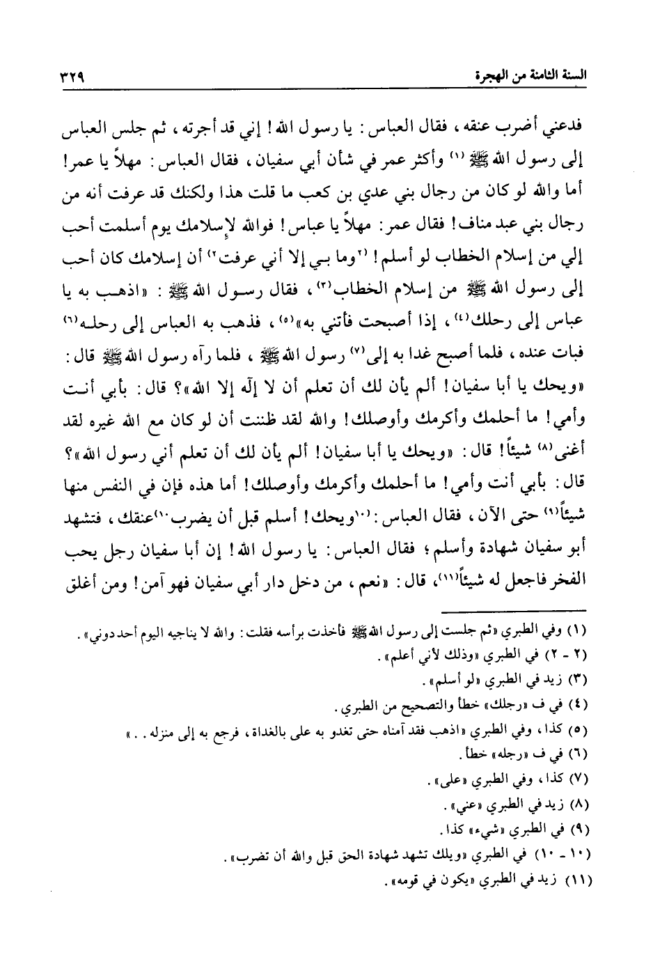 فدعني أضرب عنقه، فقال العباس: يا رسول الله! إني قد أجرته، ثم جلس العباس إلى رسول الله صلى الله عليه وسلم «1» وأكثر عمر في شأن أبي سفيان، فقال العباس: مهلا يا عمر! أما والله لو كان من رجال بني عدي بن كعب ما قلت هذا ولكنك قد عرفت أنه من رجال بني عبد مناف! فقال عمر: مهلا يا عباس! فو الله لإسلامك يوم أسلمت أحب إلي من إسلام الخطاب لو أسلم! «2» وما بي إلا أني عرفت «2» أن إسلامك كان أحب إلى رسول الله صلى الله عليه وسلم من إسلام الخطاب «3» ، فقال رسول الله صلى الله عليه وسلم: «اذهب به يا عباس إلى رحلك «4» ، إذا أصبحت فأتني به» «5» ، فذهب به العباس إلى رحله «6» فبات عنده، فلما أصبح غدا به إلى «7» رسول الله صلى الله عليه وسلم، فلما رآه رسول الله صلى الله عليه وسلم قال: