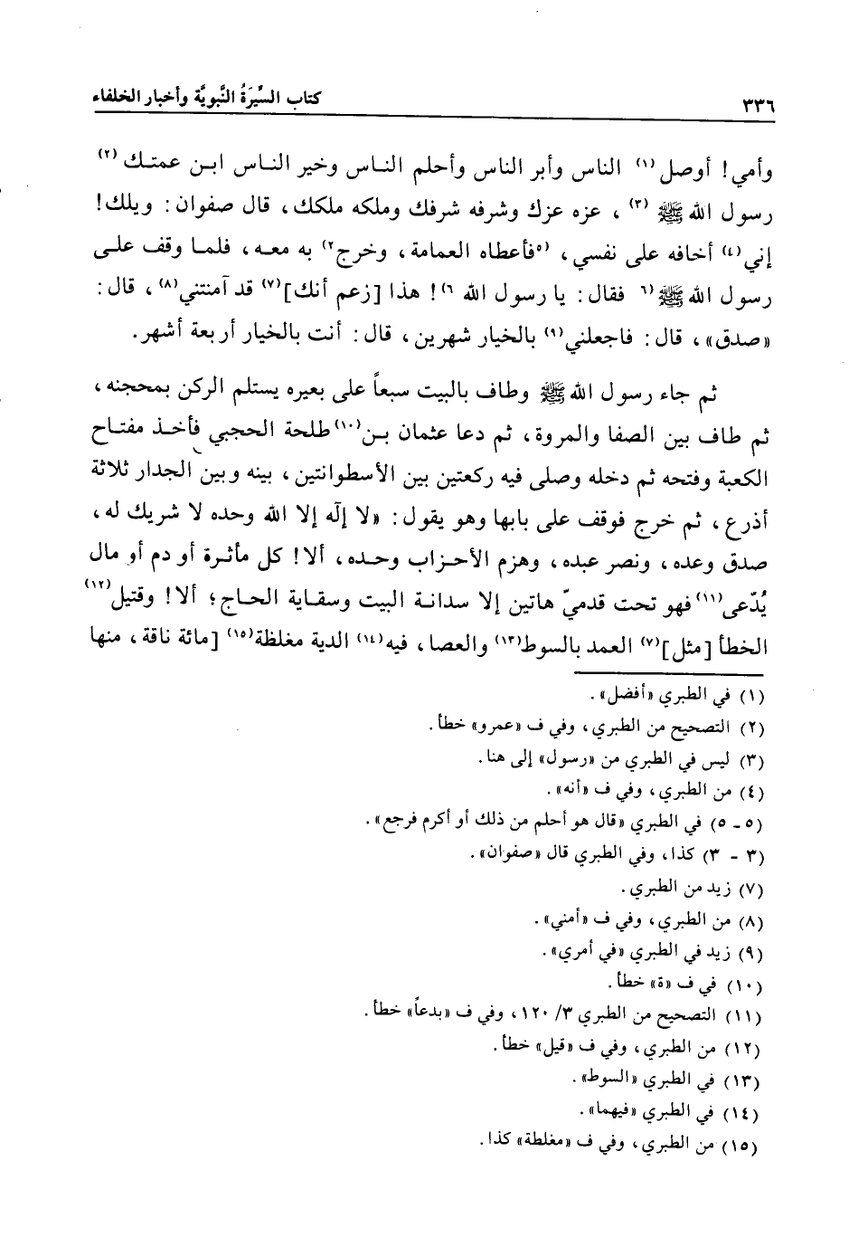 ثم جاء رسول الله صلى الله عليه وسلم وطاف بالبيت سبعا على بعيره يستلم الركن بمحجنه، ثم طاف بين الصفا والمروة، ثم دعا عثمان بن «10» طلحة الحجبي فأخذ مفتاح الكعبة وفتحه ثم دخله وصلى فيه ركعتين بين الأسطوانتين، بينه وبين الجدار ثلاثة أذرع، ثم خرج فوقف على بابها وهو يقول: «لا إله إلا الله وحده لا شريك له، صدق وعده، ونصر عبده، وهزم الأحزاب وحده، ألا! كل مأثرة أو دم أو مال يدّعى «11» فهو تحت قدميّ هاتين إلا سدانة البيت وسقاية الحاج؛ ألا! وقتيل «12» الخطأ [مثل] «7» العمد بالسوط «13» والعصا، فيه «14» الدية مغلظة «15» [مائة ناقة، منها